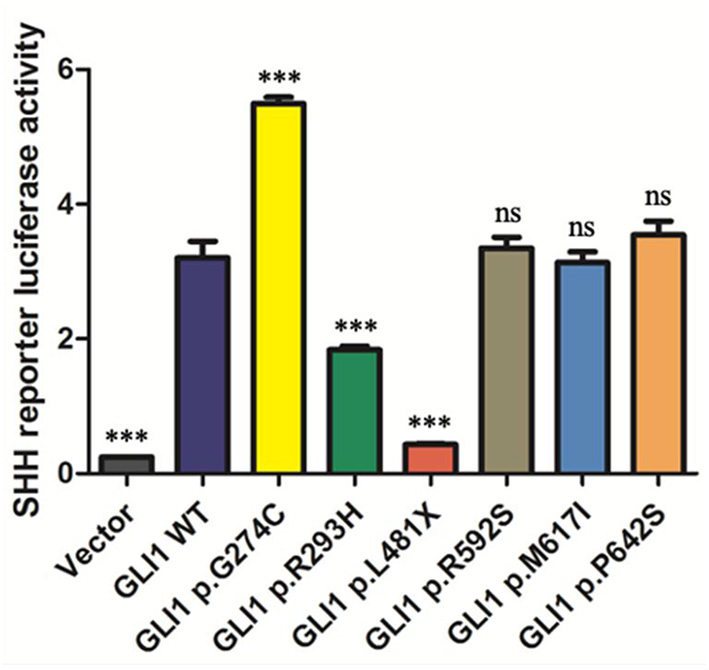 The statistical analyses of luciferase relative activity for HEK293T cells co-transfected with expressing plasmids as indicated and Sonic hedgehog (SHH) signaling pathway reporter plasmids. Activation of SHH signaling pathway pGMGLI-Lu firefly luciferase reporter by human GLI1 wild-type or mutants 24 h post-transfection in HEK 293T cells. Constitutively expressed Renilla Reniformis Luciferase served as an internal control (n ≥ 3, *P < 0.05, **P < 0.01, ***P < 0.001, ns, not significant, compared with wild-type group).