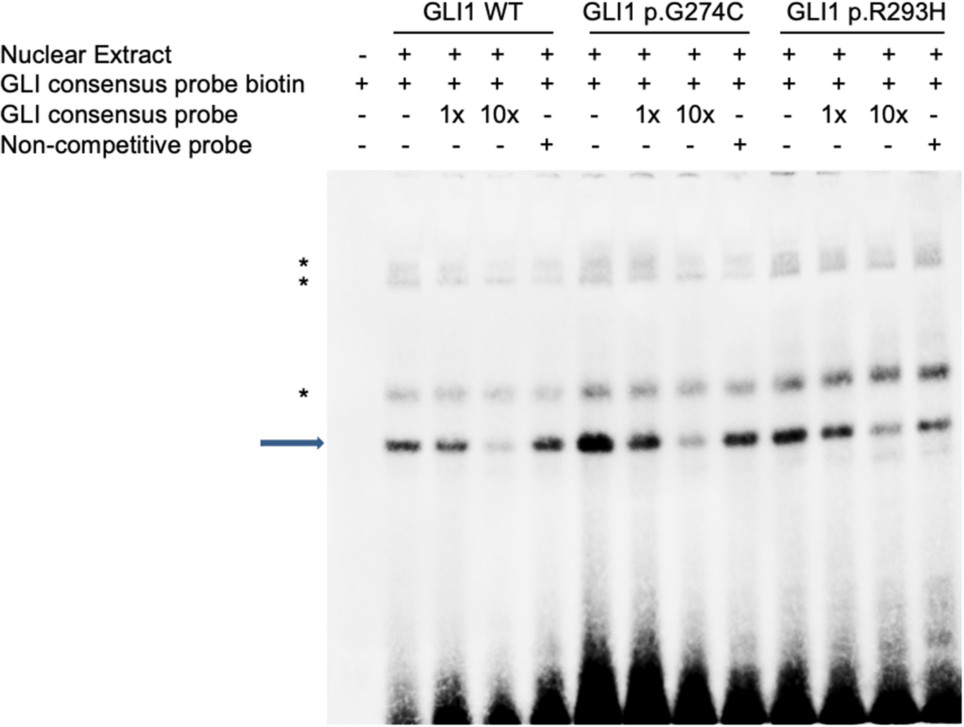 GLI1 mutations affect protein binding affinity with DNA in Electrophoretic Mobility Shift Assay (EMSA). HEK293T cells were transfected with wild-type or mutant GLI1 expression constructs. Nuclear extract was prepared and incubated with specific DNA oligos as indicated. Arrow highlights specific GLI1-DNA binding signal. Asterisks represent non-specific signals.