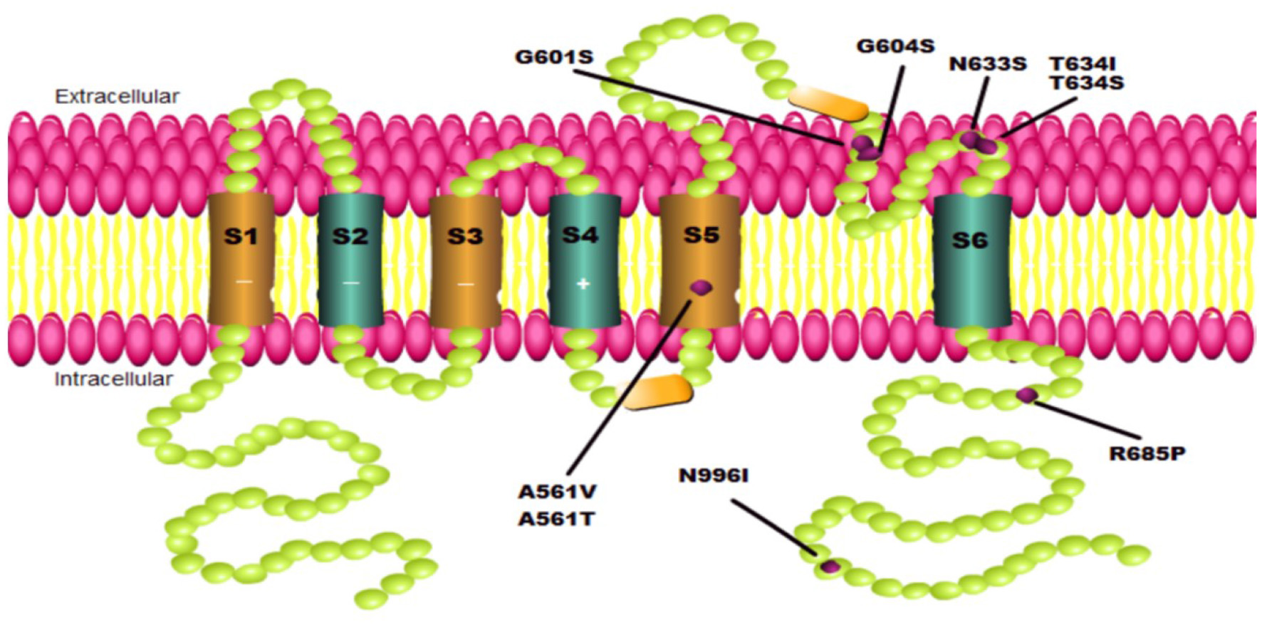 | T634I | Pore domain | Transfection | HEK-293 | No test | (9, 16) |