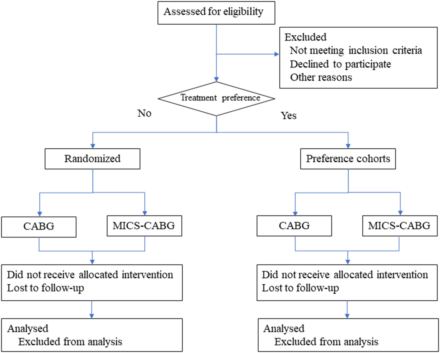 Minimally invasive cardiac surgery-coronary artery bypass grafting (MICS-CABG) has emerged as a safe alternative to standard cardiac surgery. However, treatment preferences can decrease the generalizability of RCT results to the clinical population (i.e., reduce external validity) and influence adherence to the treatment protocol and study outcomes (i.e., reduce internal validity). However, this has not yet been properly investigated in randomized trials with consideration of treatment preferences.
