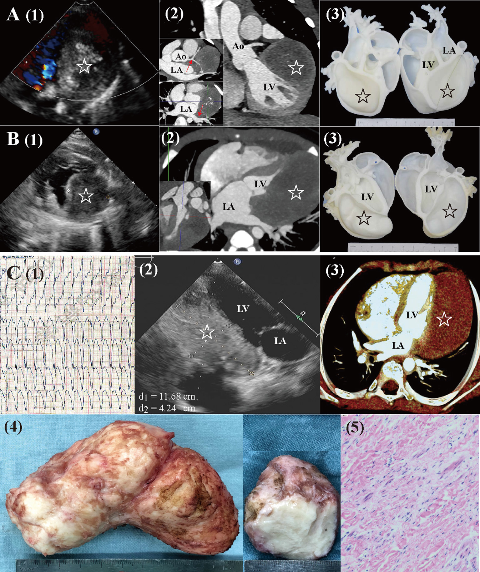 Preoperative workups and surgical resection of large cardiac fibromas. (A) Echocardiography, CTA, and 3D-printed models for a 4.2-year-old female. The mass (star) extended close to the left coronary artery and left pulmonary veins [red arrow in (2)], with visible calcification. (B) Echocardiography, CTA, and 3D-printed models for a 6-month-old male. The mass (star) extended from the base to the apex, with a distinctly larger volume than that of LV. (C) A 7.5-year-old male (1) presented with sustained ventricular tachycardia (176 bpm). (2, 3) Echocardiography and CTA revealed a huge mass (star. length: 12 cm, volume: 213 ml, and volume index: 227 ml/m2) located at LV posterolateral wall. (4, 5) Gross specimen and histologic examination of the mass, typical of fibroma. Ao, aorta; CTA, computed tomography angiography; LA, left atria; LV, left ventricle.