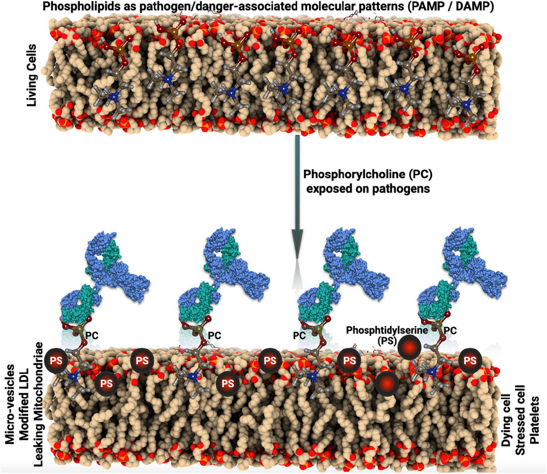 Phosphorylcholine (PC) is a danger-associated molecular pattern (DAMP), exposed on oxidized phospholipids as in oxidized low-density lipoprotein (OxLDL) and on apoptotic cells (1). In addition, PC is a pathogen-associated molecular pattern (PAMP) and an important antigen on bacteria, for example, Streptococcus pneumoniae and parasites and nematodes (Figure 1). PC is only recognized by the immune system and antibodies when exposed, bound to carriers, which can be lipids, proteins, or carbohydrates (1). IgG and IgM antibodies against PC (anti-PC) are present in healthy adults, at relatively high levels (1).