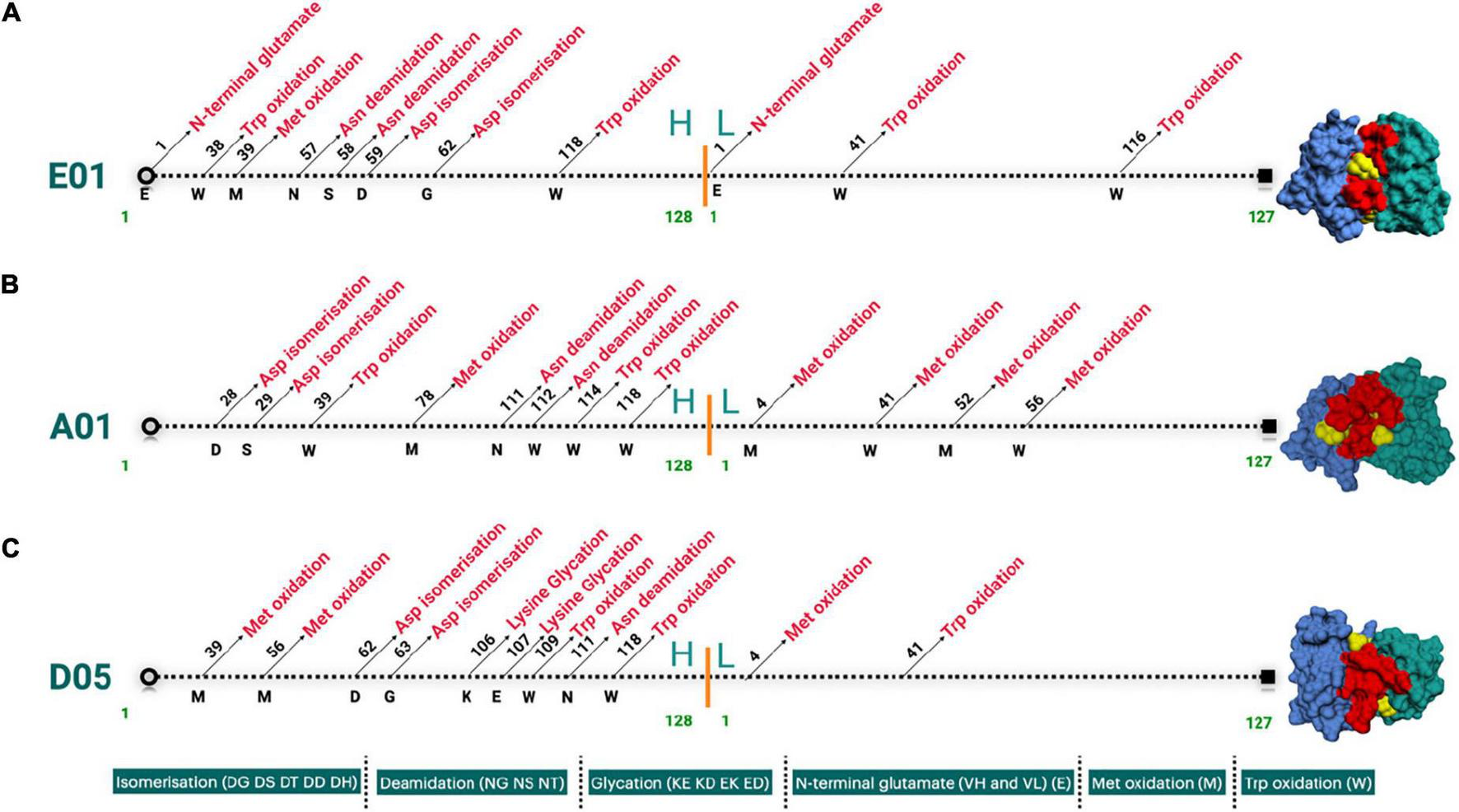 Figure 3. (A–C) Landscape of cloned antibodies sequence liabilities depicted structurally for both heavy and light chain sequences. The figure represents the sequence liabilities of various clones considered in this work, i.e., E01, A01, and D05 clones, respectively.