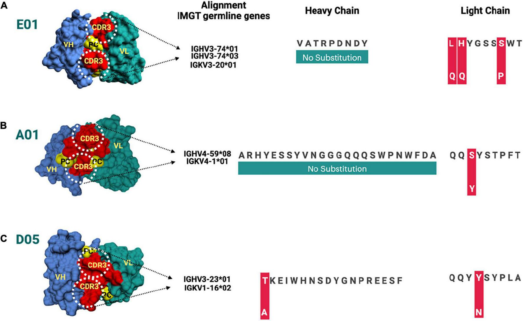 Figure 4. (A–C) Amino acid substitution map for heavy and light chain sequences compared to ImMunoGeneTics information system human (IMGT) germline genes. The amino acid substitutions are depicted for different clones, i.e., E01, A01, and D05, respectively. The red bar represents the substitution of amino acid.