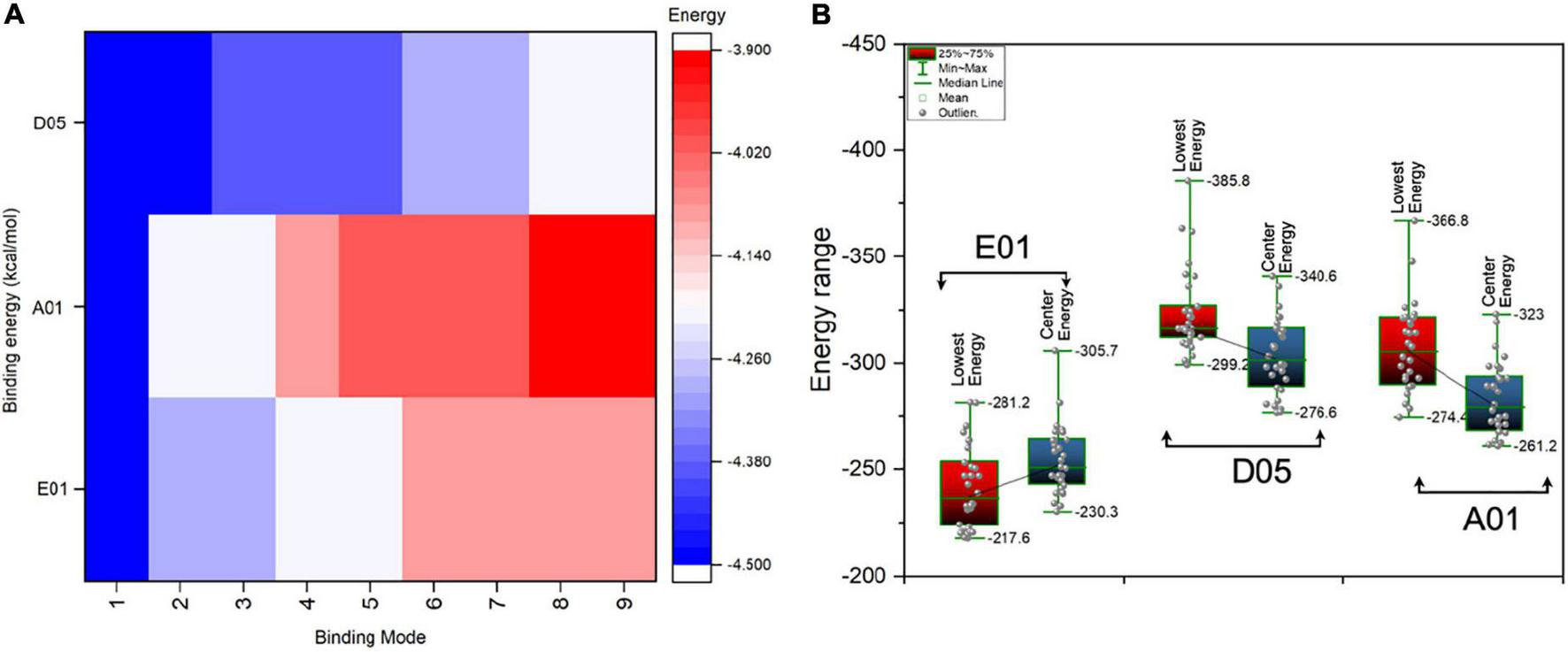 Figure 5. Binding energies (kcal/mol) of single molecule phosphorylcholine (PC) and PC conjugate with cloned antibodies, i.e., E01, A01, and D05. (A) The AutoDock Vina binding energies score of single molecule PC in kcal/mol with various clones (heatmap). The scale bar indicates the highest (indicated in blue) and lowest (indicated in red) in terms of negative score. The negative score indicated the highest binding affinity. (B) The box plot represents the antibody (clone antibodies)-antigen (PC conjugate) binding energies (lowest energies) for various clones.
