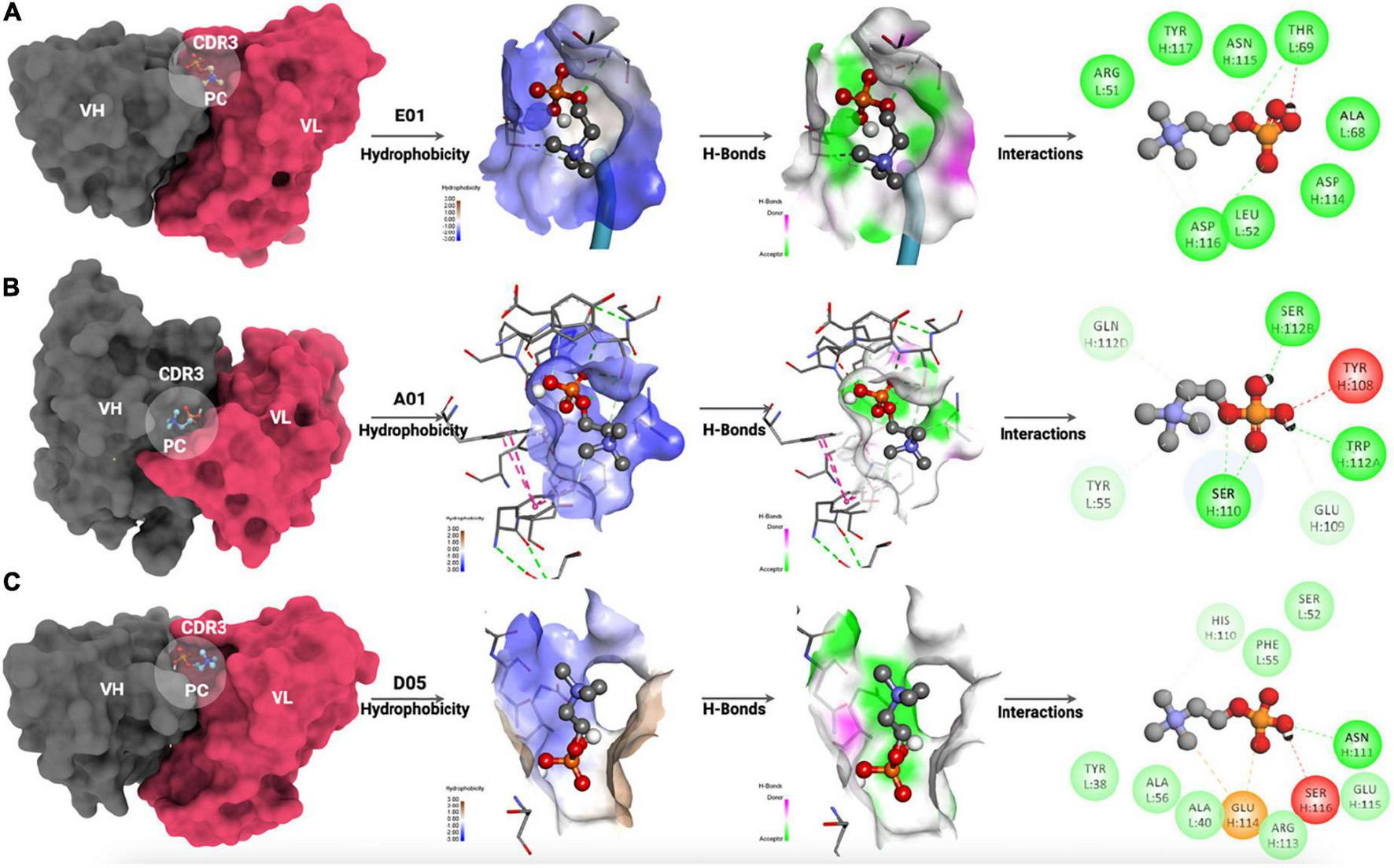 The intrinsic atomic interaction of single-molecule PC binding to the E01, A01, and D05 clone antibodies has been illustrated in Figures 6A–C.