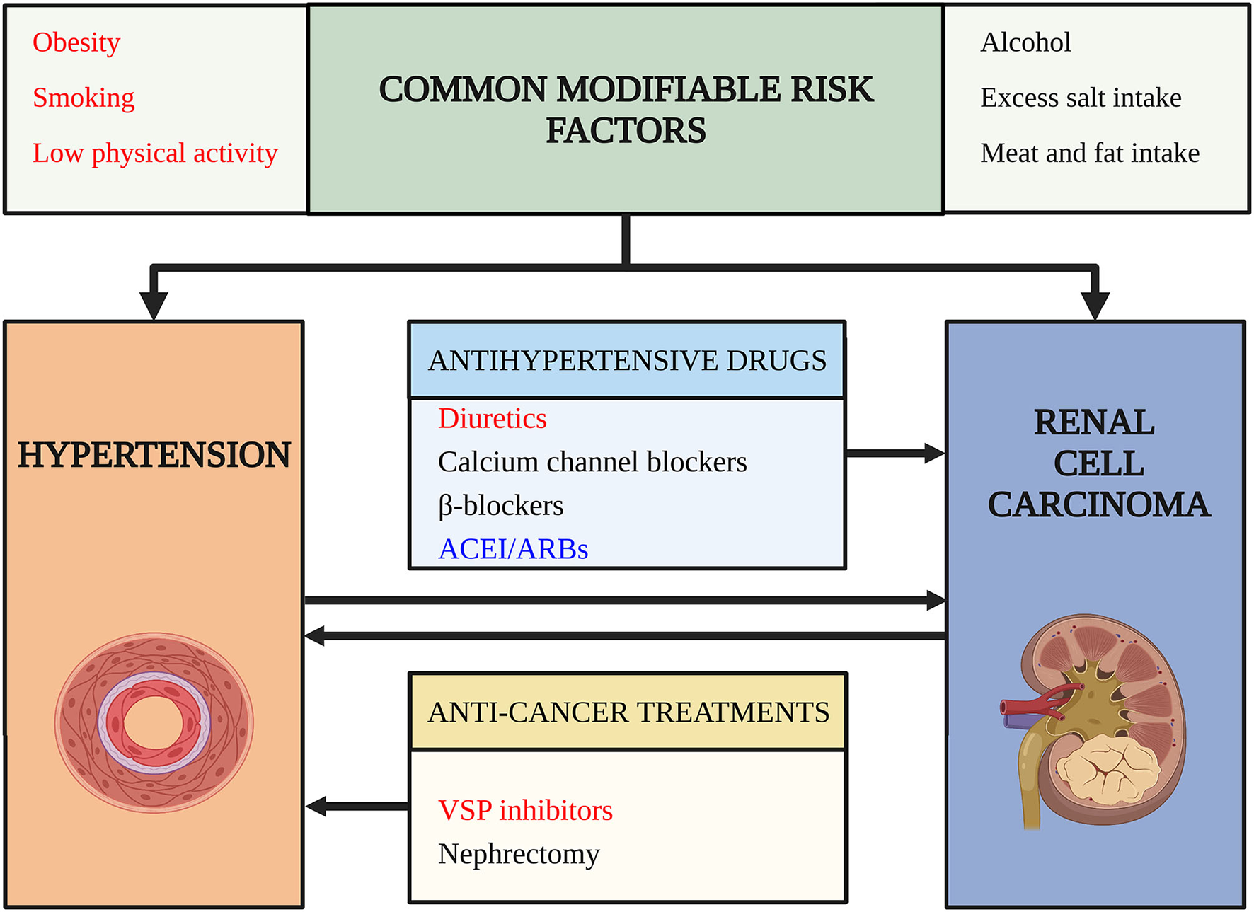Risk factors for comorbidity of hypertension (HTN) and renal cell carcinoma (RCC). This figure outlines risk factors for the comorbidity of hypertension and renal cell carcinoma. Arrows indicate a potential causality relationship. Words in red color highlight risk factors confirmed by high-level evidence and have achieved consensus. Words in black color indicate risk factors lack strong evidence or the evidence are still conflictive. Words in blue indicate risk factors that may decrease the risk of comorbidity and have protective roles. ACEI/ARB, angiotensin-converting enzyme inhibitors/angiotensin receptor blockades; VSP, vascular endothelial growth factor signaling pathway.