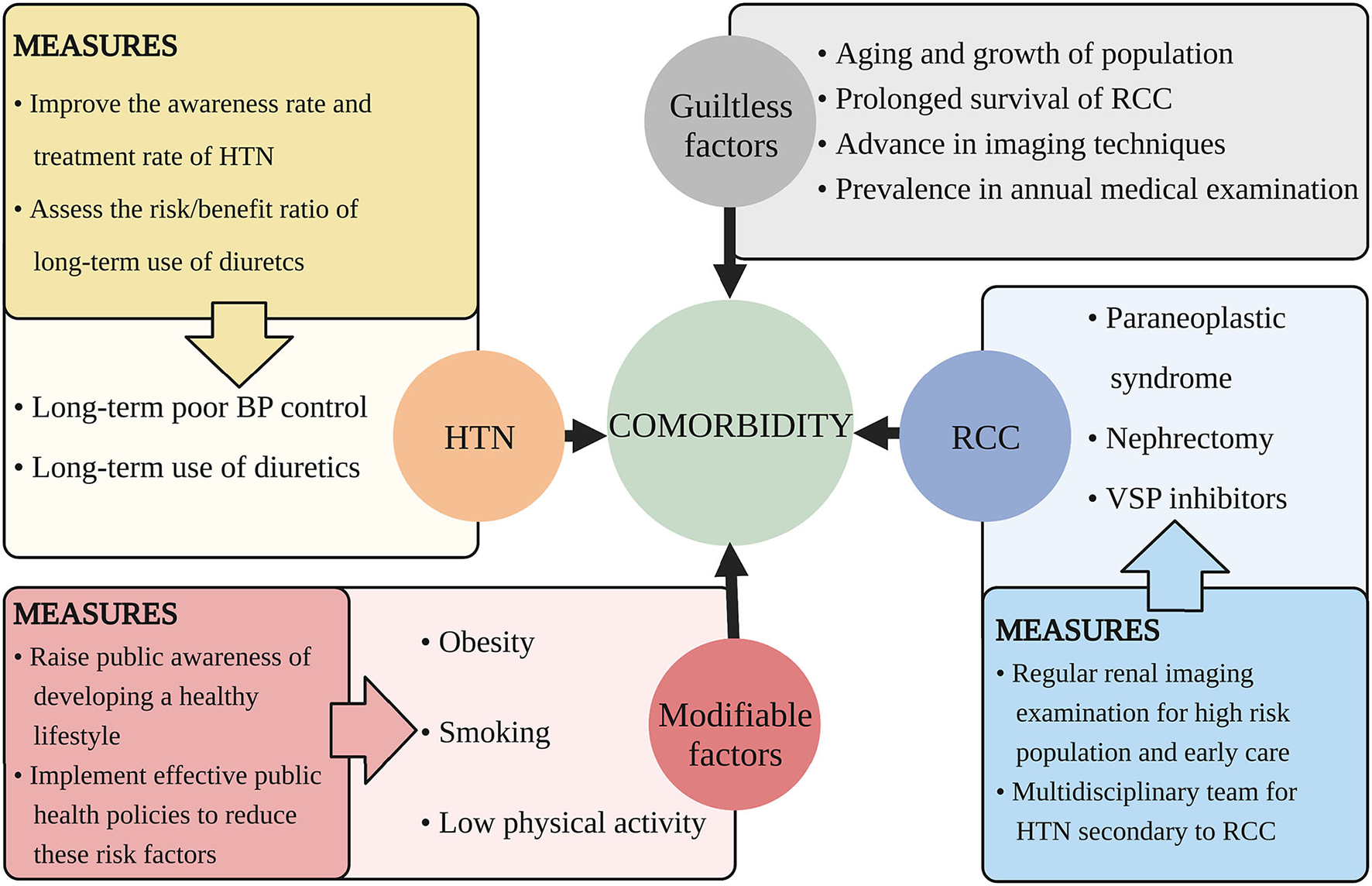 Suggested measures for decreasing the comorbidity of HTN and RCC. This figure illustrates aspects that cause the increasing comorbidity of HTN and RCC and proposes related measures. HTN, hypertension; RCC, renal cell carcinoma; BP, blood pressure; VSP, vascular endothelial growth factor signaling pathway.