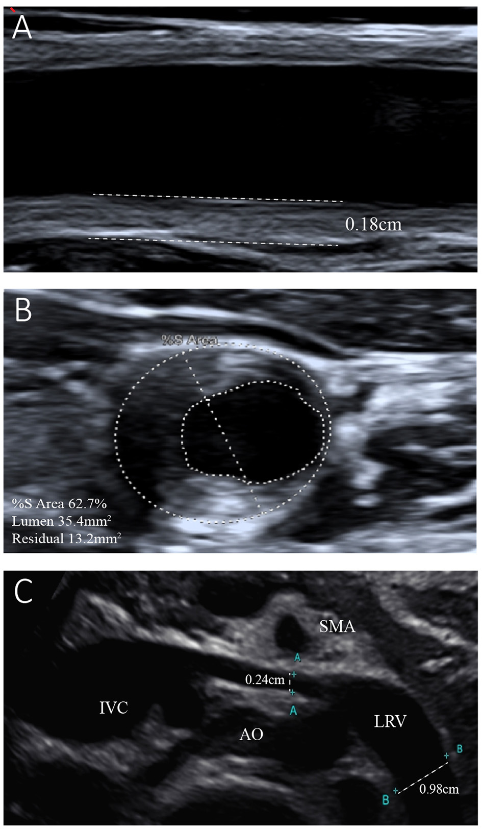 Ultrasonogram of the left common carotid artery and left renal vein. (A) Reveals left carotid atherosclerosis with plaque formation and intima-media thickness of the left common carotid artery of 0.18 cm. (B) Shows 62.7% stenosis of the left common carotid artery. (C) Shows entrapment of the left renal vein (LRV) between the aorta (AO) and superior mesenteric artery (SMA). The internal diameter of the LRV was 0.24 cm, while that of the distal segment was 0.98 cm.