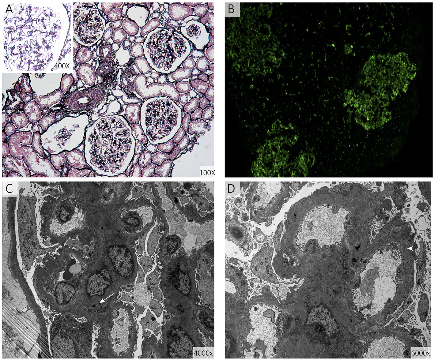 Renal biopsy specimens. (A) Shows diffuse thickening of the basement membrane of the glomerulus together with spike formation (periodic acid-silver methenamine). (B) Shows diffuse granular deposits in the vascular loops (direct immunofluorescence staining for immunoglobulin G). (C,D) show diffuse irregular thickening of the basement membrane and electron-dense deposits in the basement membrane (arrow) and sub-epithelial area (arrowhead) (electron micrograph of the glomerulus).
