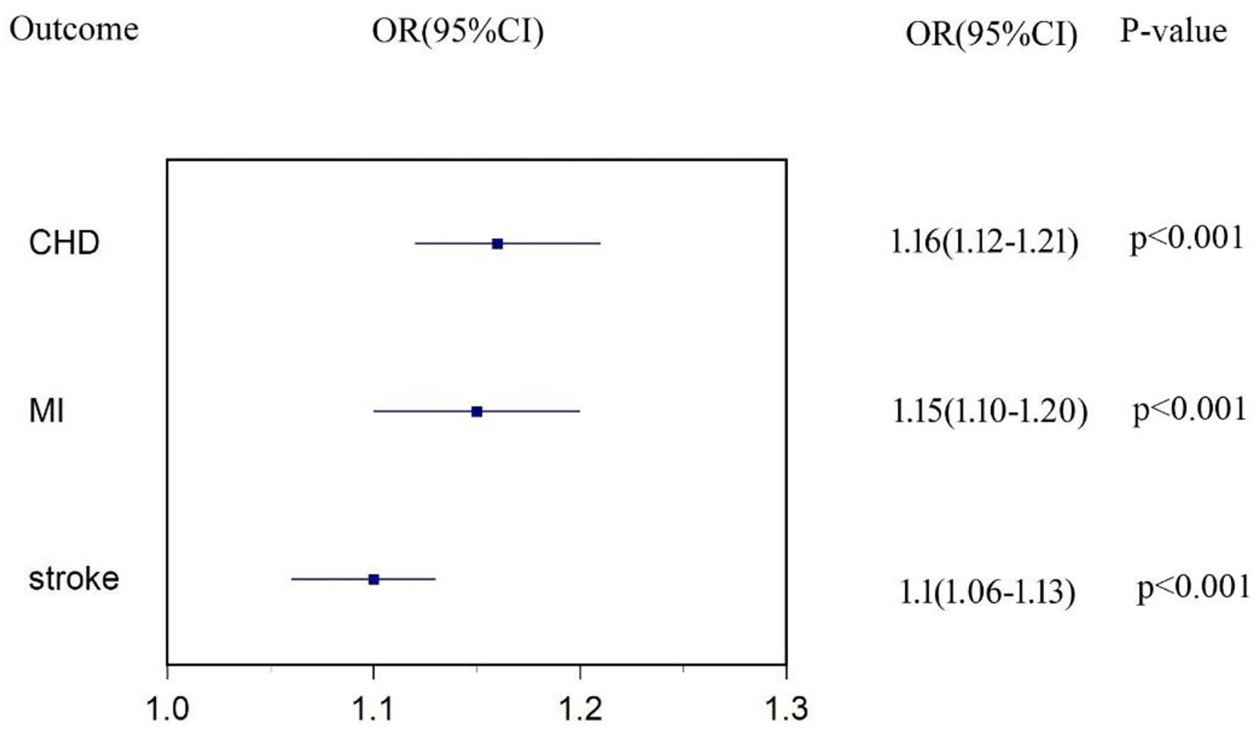We found strong evidence supporting the causality of T2DM on subtypes of CVD. Figure 1 shows the total effect of T2DM on CHD, MI, and stroke. One-unit higher log odds of T2DM increased 16% risk of CHD (OR: 1.16, 95% CI 1.12-1.21, p < 0.001), 15% risk of MI (OR: 1.15, 95% CI 1.10–1.20, p < 0.001), and 10% risk of stroke (OR: 1.10, 95% CI 1.06–1.13, p < 0.001). Details of genetic associations of T2DM on CVD were shown in Supplementary Tables 15–17.