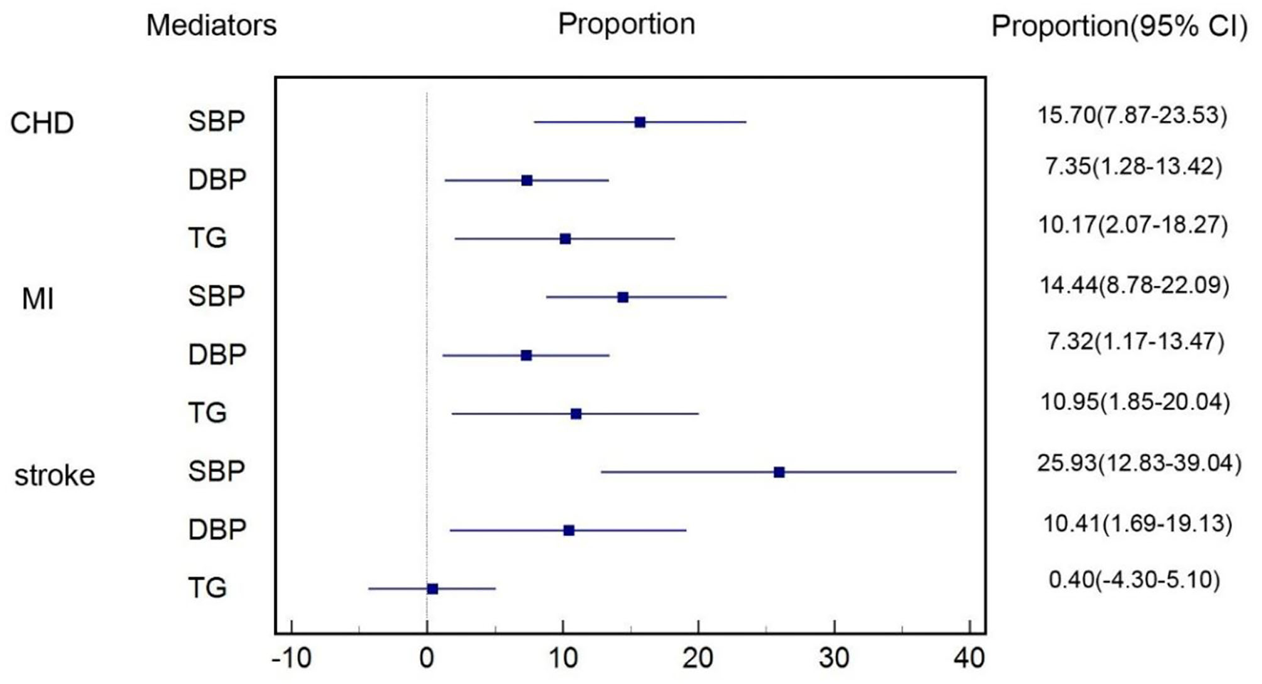 After excluding cardiometabolic factors that were not causally influenced by T2DM and those that did not have a causal effect on CVD subtypes, we took SBP, DBP, and TG for mediation analysis. Figure 4 shows the proportion of the effect of T2DM on subtypes of CVD mediated by each cardiometabolic factor included in mediation analysis. For the causal effect of T2DM on CHD, the percentage mediated by SBP, DBP, and TG was 16% (8%–24%), 7% (1%–13%), and 10% (2%–18%), respectively. The mediation effect of SBP, DBP, and TG on MI was estimated to account for 14% (7%–22%), 7% (1%–13%), and 11% (2%–20%), respectively. The proportion of the effect of T2DM on stroke mediated by SBP, DBP, and TG was 26% (13%–39%), 10% (2%–19%), and 0.4% (−4%–5%), respectively. Thus, we identified SBP, DBP, and TG were main mediators on CHD and MI, SBP, and DBP also had significant mediation effects on stroke. The total mediation effect of the combination of SBP, DBP, and TG on CHD, MI and stroke was 29%, 26%, and 13%, respectively. Details were shown in Supplementary Tables 48–50.