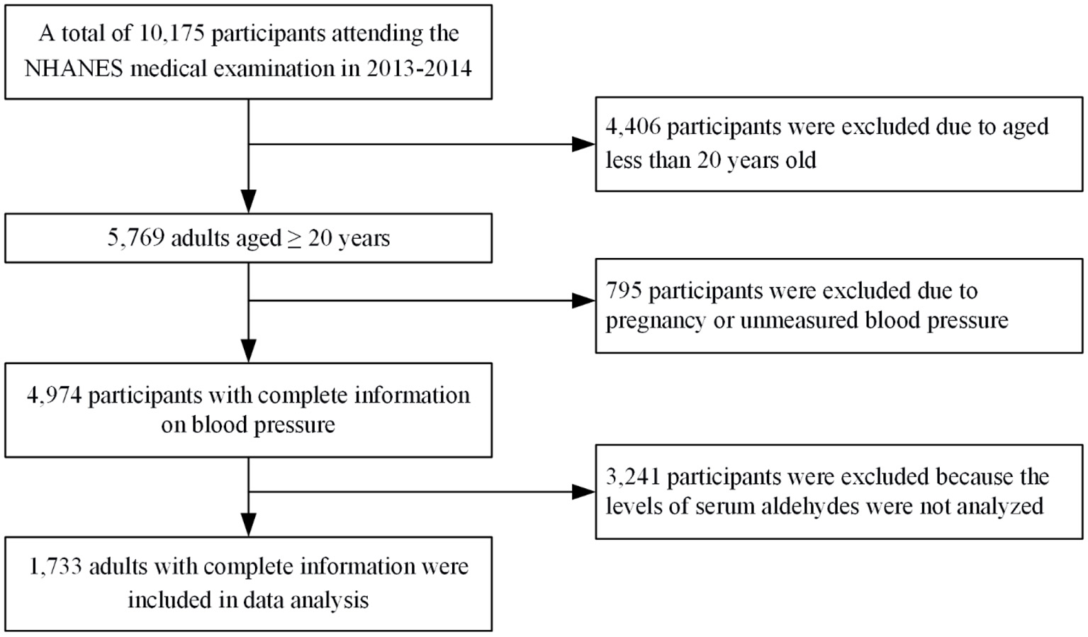 NHANES has been conducted continuously since 1999 by the National Center for Health Statistics (NCHS) at the Centers for Disease Control and Prevention (CDC), which originated from the National Health Survey Act of 1956. This program aims to provide statistical information on the health and nutritional status of representative population in the U.S. by the means of a multistage, probability sampling survey1. Data collecting was performed using household interviews, self-reported questionnaire, physical examinations, and laboratory test. The NHANES data could be publicly accessed from the internet (https://www.cdc.gov/nchs/nhanes/index.htm). In this study, we initially included participants enrolled in 2013–2014 when aldehydes measurements were available (n = 10,175). Among them, 4,406 individuals aged <20 years old and 795 individuals with pregnant or unmeasured blood pressure were excluded. We further excluded 3,241 individuals because the levels of serum aldehydes were not analyzed. As a result, a total of 1,733 individuals were included in the final analysis. The flowchart of participants selection was shown in Figure 1. The NHANES protocol was approved by the NCHS Institutional Review Committee. All the participants provided written informed consent to authorize the use of data.
