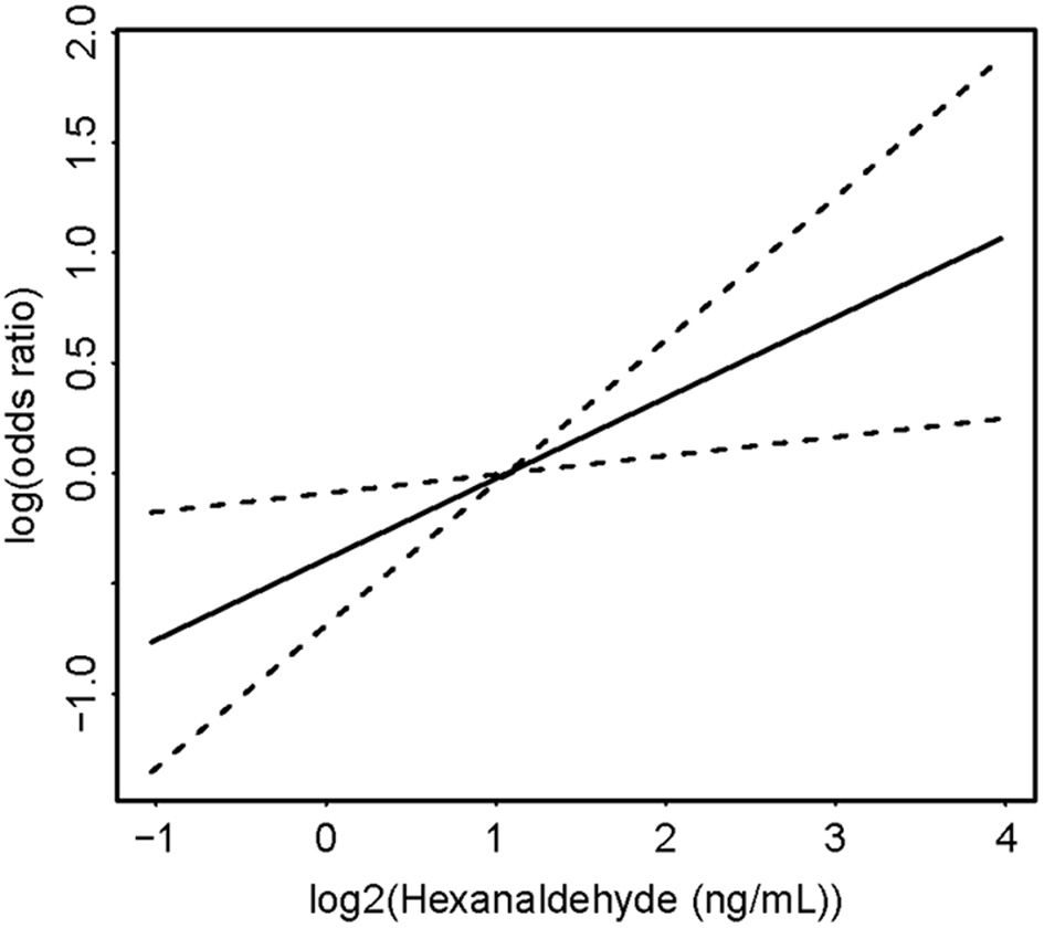 The mean age was 48.0 ± 16.7 years and an approximately equivalent of sex distribution was observed (female 49.9%). There seems to be a numerically higher level of hexanaldehyde in participants with hypertension when compared to participants without hypertension (2.6 ± 3.9 ng/mL vs. 2.3 ± 1.1 ng/mL). After adjusting for potential confounders, the odds ratio (OR) for hypertension was 2.15 [95% confidence interval (CI): 1.33–3.51] in participants from the highest quartile of serum hexanaldehyde concentration in comparison to those from the lowest quartile. Subgroup analyses and sensitivity analyses showed generally similar results.