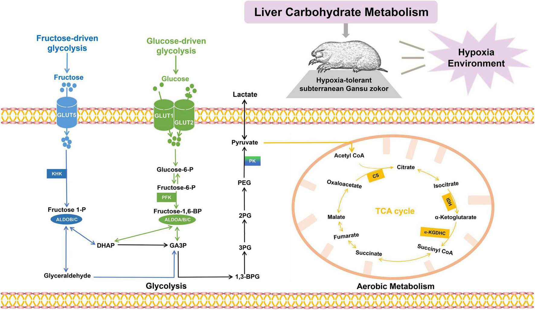 In the present study, Gansu zokor was used to investigate the characteristics of hypoxia tolerance including gut microflora profiles and molecular mechanisms. Here, we hypothesized that hypoxia could alter the structure and composition of the gut microbiome in Gansu zokor, which mediates the rewired carbohydrate metabolism to support its hypoxia resistance. Thus, we comprehensively evaluated intestinal microflora, and the physiological and liver metabolism variables in Gansu zokors under normoxic (21% of O2) and hypoxic (10.5% of O2 or 6.5% of O2) conditions (Supplementary Figure 1). Fecal samples of Gansu zokors were collected for 16S rRNA gene sequencing and metagenomic sequencing, with the aim of revealing gut microbiome compositions and functions. Furthermore, we analyzed the liver metabolite profiling and detected the transcriptional and translational levels of carbohydrate metabolism-related genes in the liver, including the pathways of glycolysis (glucose-driven and fructose-driven glycolysis) and citrate cycle (Figure 1). In the glucose-driven glycolysis pathway, glucose enters hepatocytes via GLUT1 and GLUT2 transporters, and phosphofructokinase (PFK) which is a key enzyme that catalyzes the rate-limiting step from fructose-6-phosphate to fructose-1,6-bisphosphate (Fructose-1,6-BP) (39), and the Fructose-1,6-BP is metabolized by aldolases (40). In the fructose-driven glycolysis pathway, fructose enters the liver via GLUT5 transporter and is converted by ketohexokinase (KHK) to fructose-1-phosphate (F1P); then the F1P is directly metabolized into trioses via aldolase B (ALDOB) or aldolase C (ALDOC), thus bypassing the feedback inhibition of PFK regulatory block (9). The last step of glycolysis is catalyzed via pyruvate kinase (PK), which converts phosphoenopyruvate (PEP) into pyruvate; and the PKLR isoform is expressed specifically in the liver and the red blood cells (41, 42). The pyruvate generated from glycolysis is converted into acetyl-coenzyme A (CoA), citrate synthase (CS), a key metabolic enzyme in the tricarboxylic acid (TCA) cycle, and catalyzes the formation of citric acid and acetyl-CoA; besides, the isocitrate dehydrogenase (IDH) and α-ketoglutarate dehydrogenase (α-KGDHC) also play essential roles in the TCA cycle (43, 44). We then tested the activities of critical enzymes and the levels of glucose and fructose. The aim of these assays is to reveal the mechanisms of hypoxia tolerance in subterranean rodents.