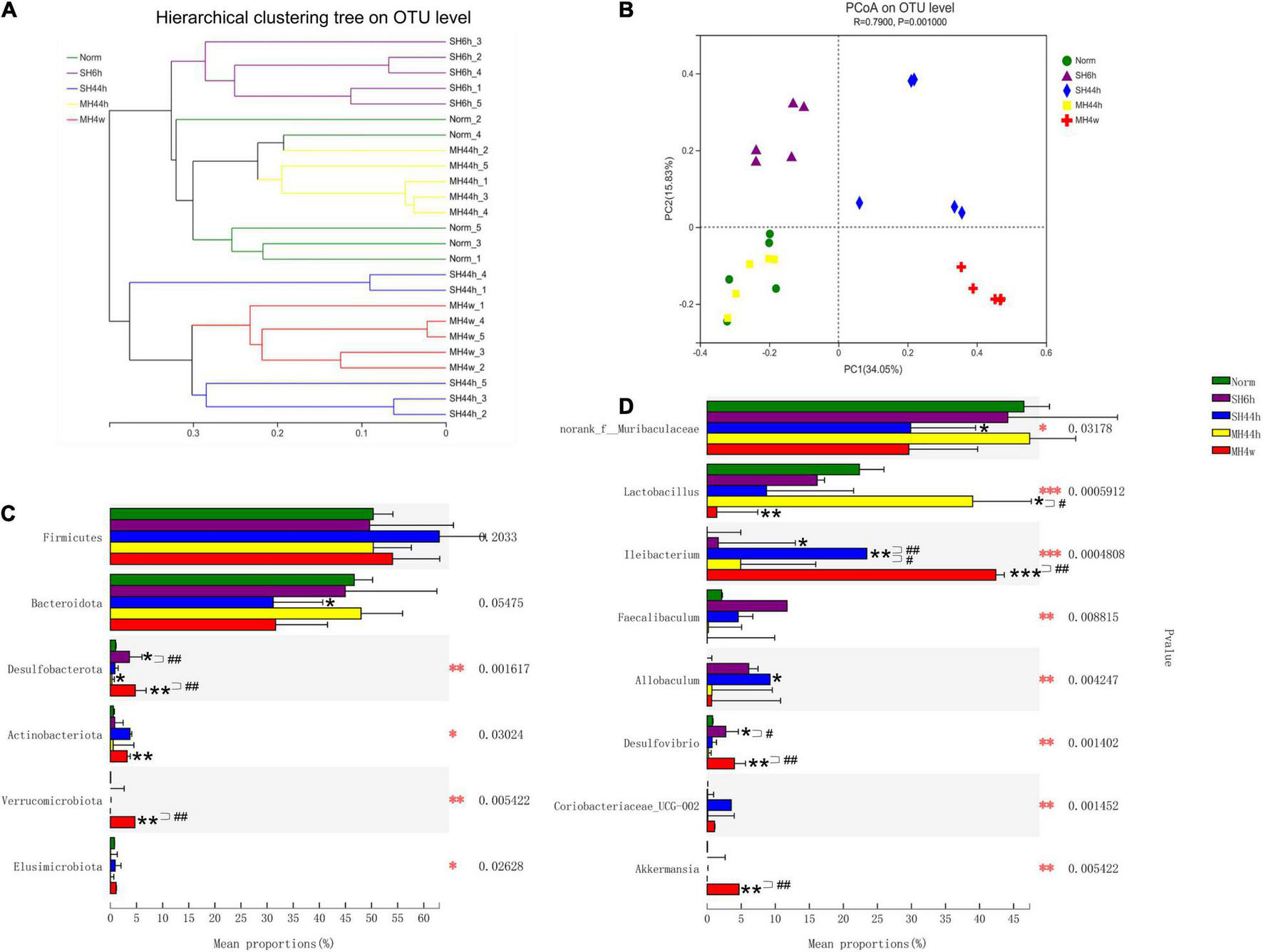 Beta-diversity of gut microbiota of Gansu zokors and relative abundances of microbial taxa. (A) Hierarchical cluster analysis of Bray–Curtis distances generated from taxa tables summarized at the OTU level. (B) Principal Coordinates Analysis represents the differences in the gut microflora among groups. Kruskal–Wallis test was used to examine the differences in the microbial taxa among the groups at the phylum level (C) and genus level (D). The differences in the bacterial community composition among the different treatments by Kruskal–Wallis test (red asterisks). Black asterisks indicate the comparison between the control and hypoxia treatment groups by student’s t-test. Statistical symbols: *P < 0.05, **P < 0.01, and ***P < 0.001 between normoxia and hypoxia treatments; #P < 0.05 and ##P < 0.01 between two hypoxic groups under the same oxygen concentration or the same treatment duration.