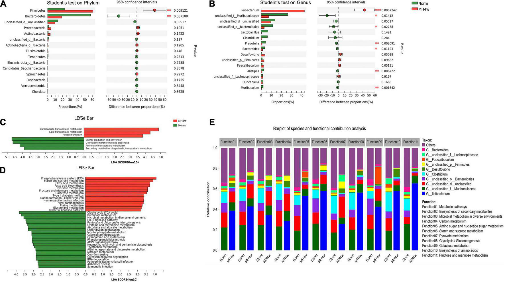 Statistical comparison of relative abundances of dominant microbial phyla (A) and genera (B) under normoxia and MH4w groups. Linear discriminant analysis (LDA) integrated with effect size (LEfSe) analysis of a cluster of orthologous groups of proteins (COG) (C) and the Kyoto Encyclopedia of Genes and Genomes (KEGG) (D) pathways between normoxia and MH4w groups (LDA score > 2.5, P < 0.05). (E) Relative contribution to carbohydrate metabolic pathways (top 11 in level 3) within the bacterial communities (top 10). Statistical symbols: *P < 0.05, **P < 0.01, and ***P < 0.001.