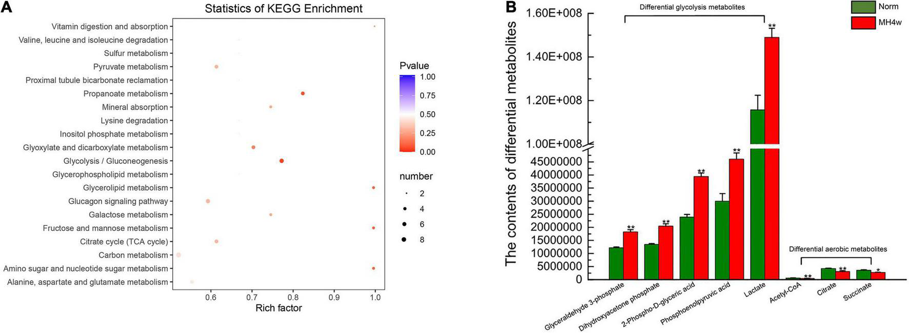 Liver differential metabolites between the two groups (Norm vs. MH4w). (A) Differential metabolite KEGG enrichment; the bigger the circle, the greater is the number of differential metabolites enriched in the pathway, the redder the circle, the more significant the enrichment. (B) Differential metabolites in glycolysis and aerobic metabolism. All data are presented as mean ± SD. Statistical symbols: *P < 0.05 and **P < 0.01.