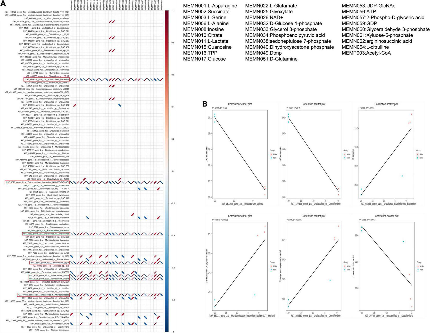 Correlation between differential metabolites and microorganisms. (A) The correlation heatmap of metabolites and microorganisms; red ellipses indicate positive relationship, blue ellipses indicate negative relationship (narrow ellipse = stronger correlation). (B) Scatter plots of some gut microflora–related metabolites, including L-Glutamate, glucose, 2-Phospho-D-glyceric acid, phosphoenolpyruvic acid, and citrate/citric acid.