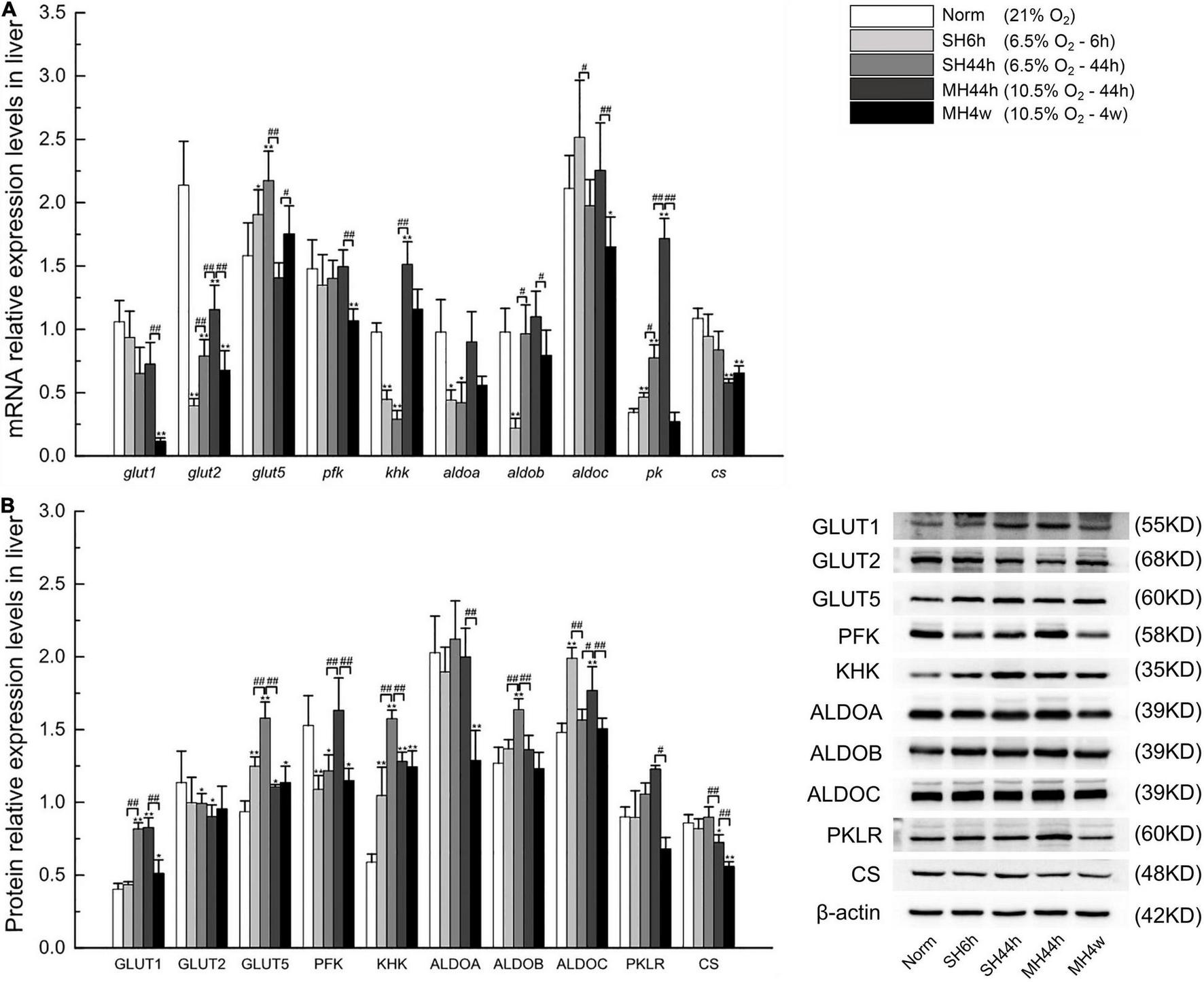 Transcription and translation level analyses of carbohydrate metabolism-related transporters and enzymes in Gansu zokor. (A) Gene expressions graph, (B) protein expression graph, and the representative images of at least three separate blots on the right side of it showing the expression of the proteins. All data are presented as mean ± SD. Statistical symbols: *P < 0.05 and **P < 0.01 between normoxia and hypoxia treatment; #P < 0.05 and ##P < 0.01 between two hypoxic groups under the same oxygen concentration or the same treatment duration.