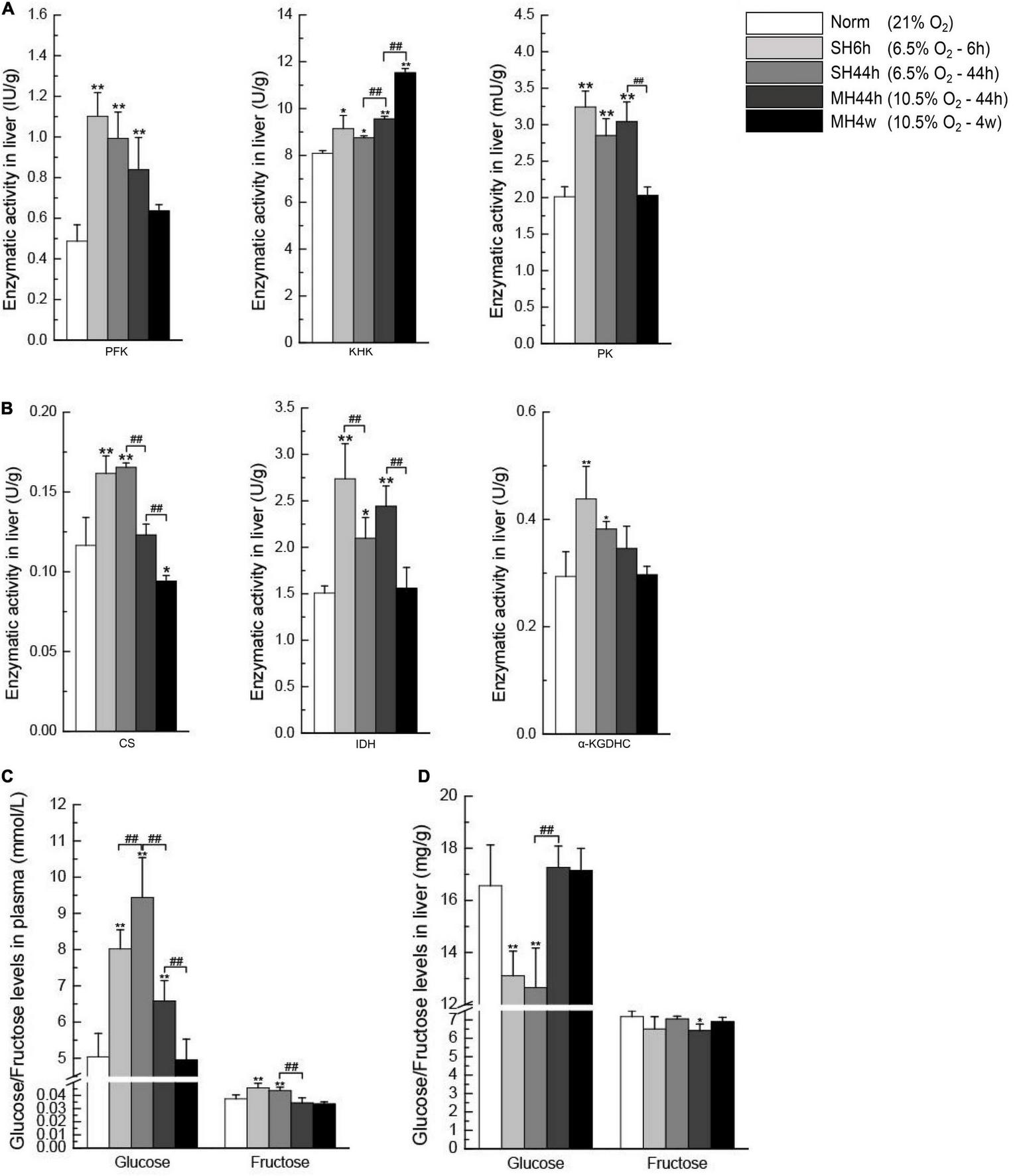 Enzymatic activity analyses of carbohydrate metabolism and glucose and fructose levels in the plasma and the liver. The activities of PFK, KHK, and PK (A) and CS, IDH, and α-KGDHC (B). Plasma glucose and plasma fructose levels (C). Liver glucose and liver fructose levels (D). All data are presented as mean ± SD. Statistical symbols: *P < 0.05 and **P < 0.01 between the normoxia and hypoxia treatment; ##P < 0.01 between two hypoxic groups under the same oxygen concentration or the same treatment duration.
