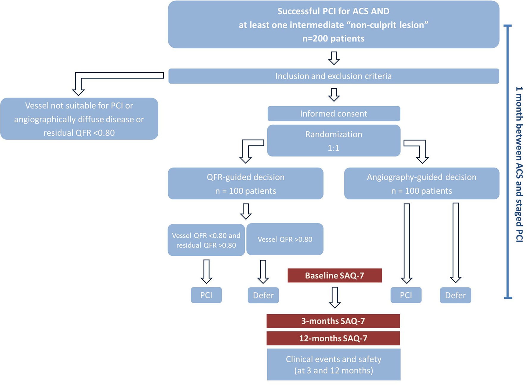 After treatment of the culprit lesion(s), a total of 200 consecutive ACS patients will be randomized 1:1 to angiography- vs. QFR-guided revascularization of non-culprit stenoses. Patients and clinicians responsible are blinded to the randomization group. The primary functional endpoint is defined as the proportion of patients assigned to medical treatment in the two groups. The primary clinical endpoint is a composite of death, non-fatal myocardial infarction, revascularization and significant angina at 12 months. Secondary endpoints include changes in the SAQ subgroups, and clinical events at 3- and 12-month follow-up.