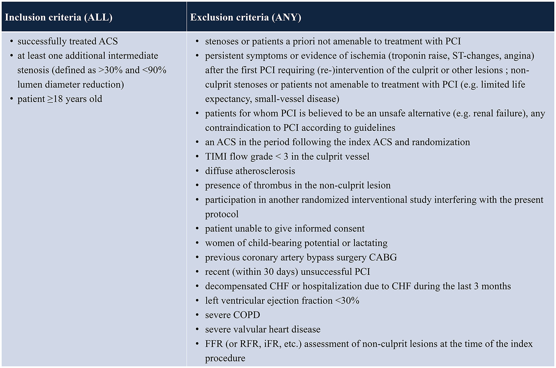 All patients with unstable angina, NSTEMI or STEMI who have received successful PCI (Thrombosis in Myocardial Infarction score of at least 2 and residual stenosis <30%) of all culprit lesions and receive guideline-directed medical therapy will be evaluated. Patients who present at least one non-culprit coronary artery lesion (>30 and <90% by visual estimation in a major epicardial coronary artery or major side branch measuring ≥2.0 mm in diameter) that is judged to be amenable to PCI will be screened for enrolment. Patients with multiple lesions and/or lesions in more than one vessel can be included. Patients will be excluded if any of the following criteria applies: age <18 years; persistent symptoms or evidence of ischemia (troponin raise, ST-changes, angina) following treatment of the ACS-culprit lesion and requiring (re-)intervention of the culprit or other lesions; non-culprit stenoses or patients not amenable to treatment with PCI (e.g., limited life expectancy, small-vessel disease); patients for whom PCI is believed to be an unsafe alternative (e.g., renal failure); any contraindication to PCI according to guidelines; presence of thrombus in the non-culprit lesion; participation in another randomized interventional study interfering with the present protocol; women of child-bearing potential or lactating; previous coronary artery bypass graft (CABG) surgery; recent (within 30 days) unsuccessful PCI; decompensated congestive heart failure (CHF) or hospitalization due to CHF during the last 3 months; left ventricular ejection fraction <30%; severe chronic obstructive pulmonary disease (COPD); severe valvular heart disease; FFR or RFR (resting full cycle ratio) oder iFR (instantaneous wave free ratio) assessment of non-culprit lesions at the time of the index procedure (see Table 1). Patients unable to understand the scope of the study are classified as not able to give informed consent and are ineligible for study enrollment. Likewise, patients unable to consent, e.g., for a neurological damage, are treated as not able to give informed consent and are excluded.