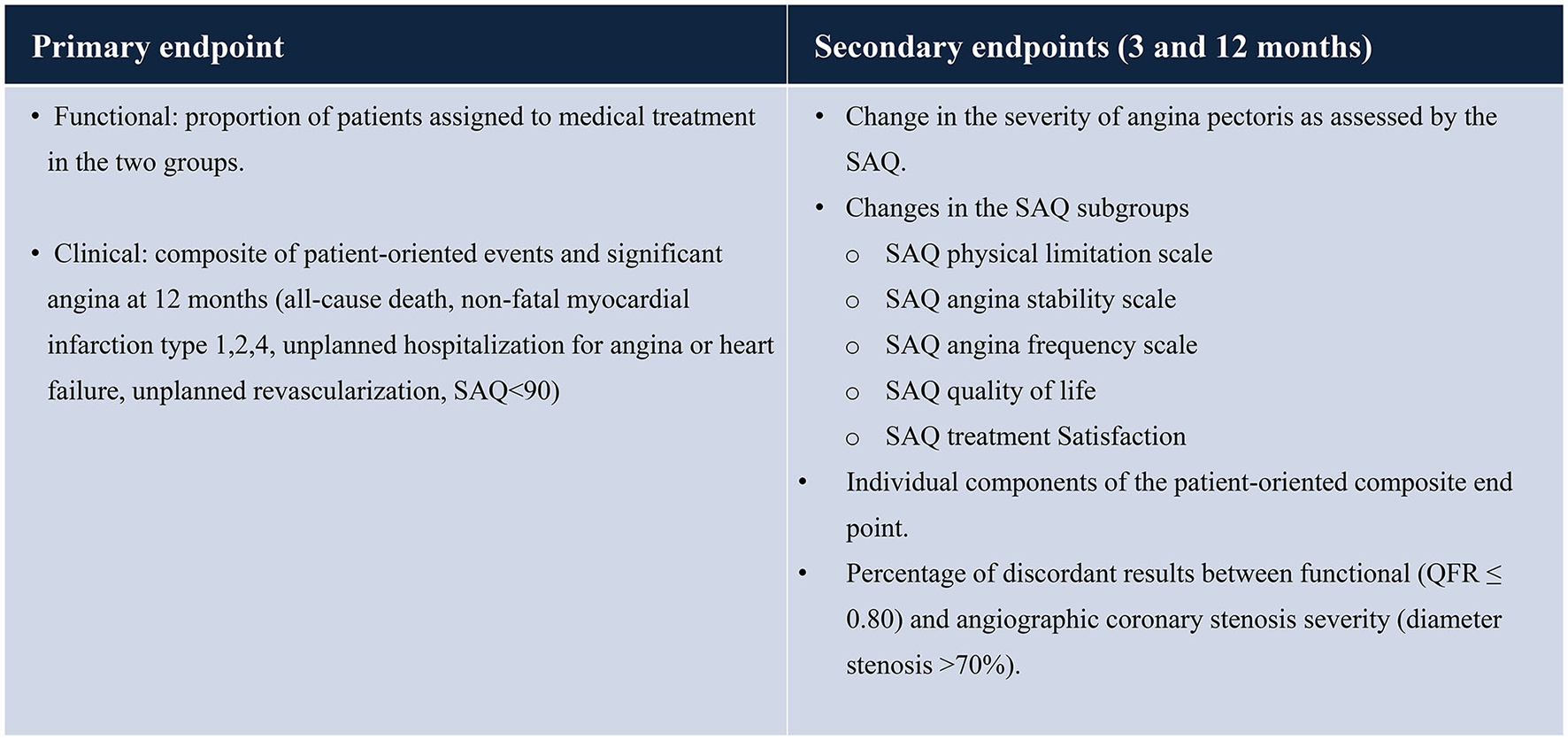 Primary endpoint (functional): the primary endpoint (functional) is the proportion of patients assigned to medical treatment in the two groups (QFR vs. Reference) (see Table 2).