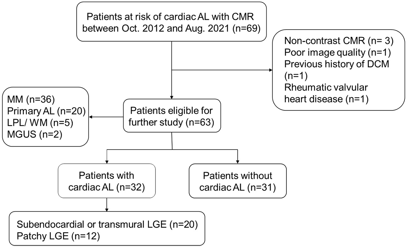 AL CA could occur in patients with diagnosed AL amyloidosis or other diseases with potential to proceeding into secondary AL amyloidosis, including multiple myeloma (MM), lymphocytic lymphoma (LPL)/Waldenstrom macroglobulinemia (WM), and monoclonal gammopathy of undetermined significance (MGUS) (14, 15). These patients would be defined as “at risk of AL CA” and undergo CMR scan when there were heart-related abnormalities in echocardiography, ECG, and lab tests (cardiac biomarkers) or when their clinicians considered there was necessity to exclude the presence of AL CA, especially in patients with proved systemic AL. Sixty-nine patients at risk of AL CA underwent CMR scan between October 2012 and August 2021 were initially integrated into our study (n = 69). Six patients met the following exclusion criteria were then excluded: Absence of LGE imaging (n = 3); poor image quality (n = 1); previous history of dilated cardiomyopathy (n = 1); coexistence with rheumatic valvular heart disease (n = 1). Ultimately, sixty-three patients were included (Figure 1). AL CA would be diagnosed if typical CA LGE pattern was observed. Typical LGE pattern was defined as: circumferential entire sub-endocardium involvement with different degree extension to surrounding myocardium, diffuse myocardial enhancement without myocardium nulling, or a scattering patchy pattern on LGE-imaging (14). Thirty-two patients were considered AL CA+ and thirty-one patients AL CA- according to the typical LGE criteria. Among AL CA+ patients, 18 (56%) patients had extra-cardiac biopsy proved amyloid deposition; 11 (34%) patients were with monoclonal protein identified by serum or urine immunofixation while extra-cardiac biopsy was negative or not performed in our hospital; 3 (9%) patients were with characteristic circumferential subendocardial LGE or diffuse LGE which could not be explained by other causes rather than CA.