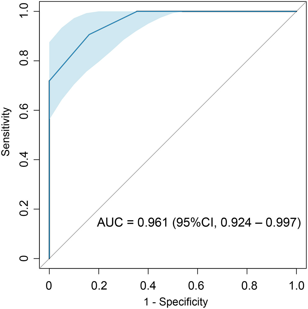 The risk score finally consisted of 4 parameters: pericardial effusion (PE) (1 point), low electrocardiographic QRS voltages (LQRSV) (1 point), CMR-derived impaired global radial strain (GRS) (<15.14%) (1 point) and increased left ventricular maximum wall thickness (LVMWT) (>13 mm) (2 points). Total score ranged from 0 to 5 points. A cut-off point of 1.5 showed highest accuracy in diagnosing AL CA with an AUC of 0.961 (95% CI: 0.924–0.997, sensitivity: 90.6%, specificity: 83.9%). Kaplan-Meier plots and log-rank test showed that the high-risk group had significantly poor overall survival rates.