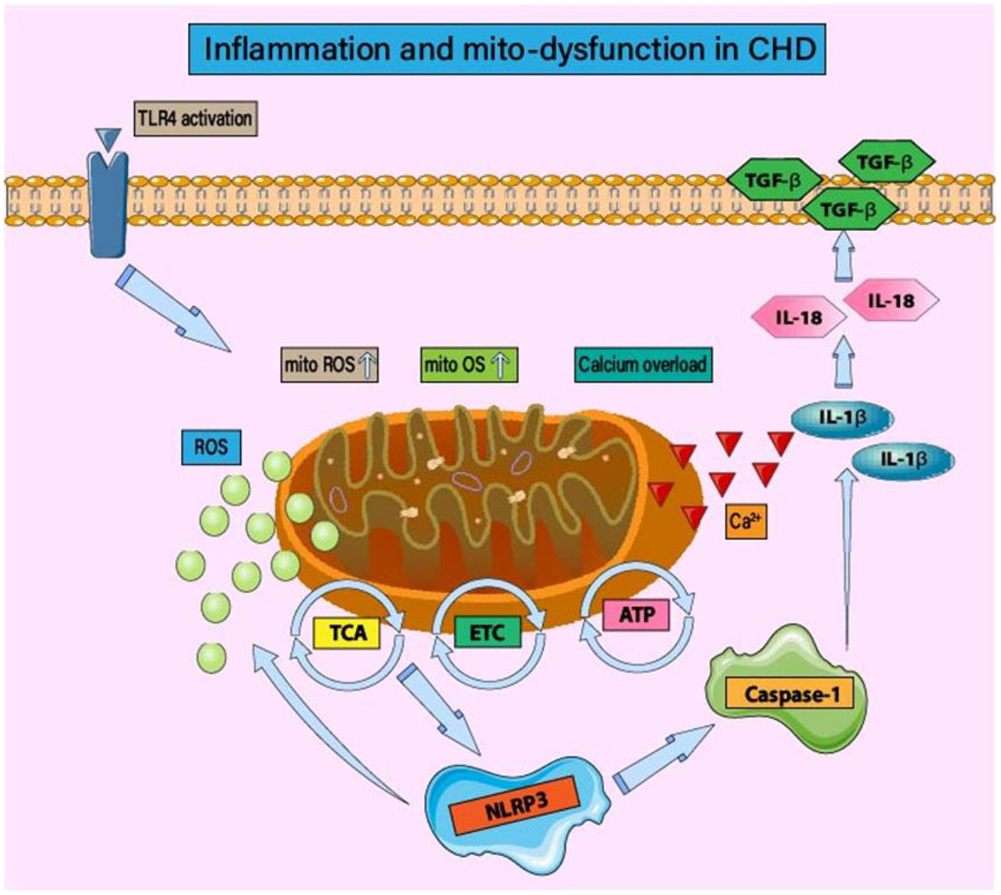 Inflammation and mitochondrial dysfunction in CHD. Under mitochondrial oxidative stress and structural/functional imbalance, the activation of inflammatory bodies is regulated by mitochondrial function. The main mechanism is that the imbalance of mitochondrial homeostasis leads to the production of inflammatory body components NLRP3, caspase-1, and IL-1 β/IL-18. In the early stage of CHD, the activation of TLR4 leads to mitochondrial energy metabolism disorder, tricarboxylic acid cycle disorder, and insufficient ATP production. Mitochondrial dysfunction also affects the regulatory function of ETC. ROS-induced oxidative stress injury is accompanied by calcium homeostasis disorder and calcium overload. The activation of NLRP3 and the occurrence of inflammatory injury lead to the excessive production of ROS and the persistence of the vicious cycle of “inflammation-oxidative stress.” Mitochondrial homeostasis disorder can induce post-translational modification of NLRP3, stabilize NLRP3 in an inactive but activated state of signal transduction, and then affect the activation of inflammatory signal pathways such as NF-κB.
