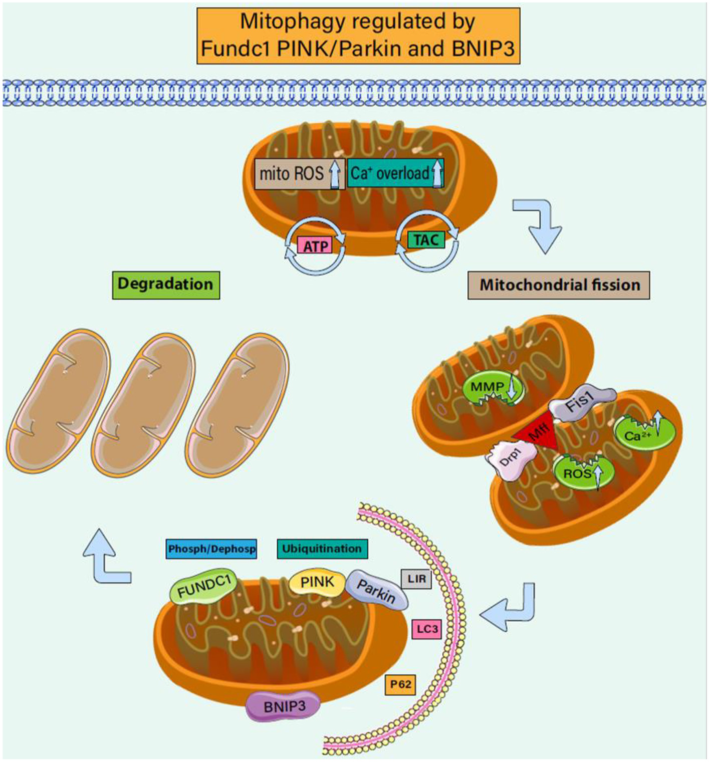 Mitophagy regulated by Fundc1 Pink/Parkin and BNIP3. Mitophagy is a biological process that selectively scavenges damaged mitochondria. It plays an important role in regulating the number of mitochondria in cells, maintaining the structure and function of mitochondria, and maintaining the homeostasis of cell energy metabolism. It is also an important mechanism for the quality control of mitochondria and plays an important role in the process of CHD accompanied by cardiomyocyte injury. Under CHD-induced stress, mitochondrial membrane potential decreases and ROS is overproduced, and the endoplasmic reticulum inputs more calcium ions into mitochondria. Driven by mitochondrial fission proteins drp1, MFF, and FIS1, mitochondria split into two sub mitochondria. Under the phosphorylation (dephosphorylation) of Fundc1 and the receptor regulation of BNIP3, the dysregulated daughter mitochondria react with LC3/LIR to form autophagic lysosomes. The ubiquitination of PINK/Parkin also mediates the formation of autophagic lysosomes. Under the regulation of mitophagy, damaged mitochondria are further cleared.