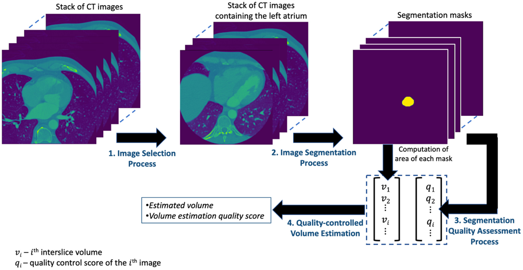 The presentations related to DL in this paper follow the relevant aspects of the recommendation of the Proposed Requirements for Cardiovascular Imaging-Related Machine Learning Evaluation (PRIME) guidance (10). The overview of the proposed framework for estimating the volume of LA is shown in Figure 1 and consists of four main processes. The image selection process performs an image classification task for selecting images containing the LA from the set of all CT images acquired for a given patient. The image segmentation process obtains the segmentation mask from the selected images of the preceding process. The segmentation quality assessment process quantifies the quality of the segmentation task while the quality-controlled volume estimation process computes the LAV and quantifies the accuracy of that computation. Each of these processes is described in detail in subsequent subsections.