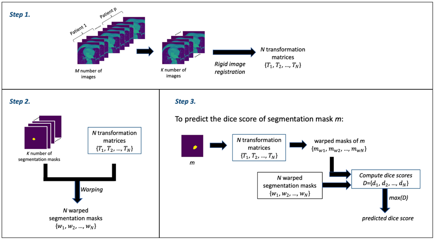 The RCA algorithm consists of 3 main steps: Step 1 involves the image registration (rigid registration) of some N number of (moving) images against the kth (fixed) image to obtain a set of N transformation matrices; Step 2 involves using the transformation matrices from Step 1 to warp the segmentation masks of the N images—thereby obtaining a set of N warped segmentation masks; and Step 3 involves the prediction of the dice score. Thus, for a given mask, say mask m, from the output of the DL segmentation model, a set of warped masks are computed using the transformation matrices obtained in Step 1; these warped masks of mask m are then compared with the all warped segmentation masks obtained in Step 2 as ground truth in order to obtain the set of dice scores. The maximum dice score in the set of dice scores is assumed to be the predicted dice score—which is often an estimate that is good.
