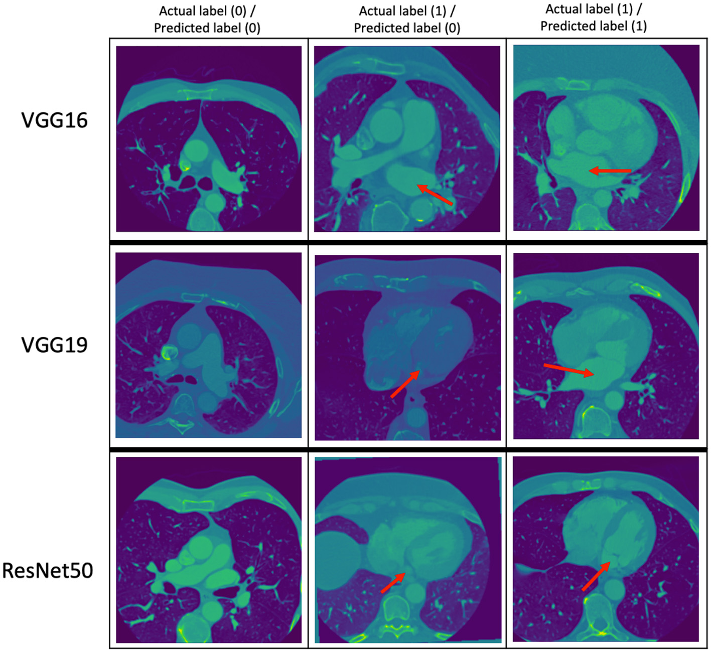 We consider three DL architectures that can be used for the image classification task of selecting images containing the LA from the set of all CT images acquired for a given patient. These architectures are based on the VGG (VGG16 and VGG19) (11) and the ResNet (ResNet50) (12) architectures. The configuration of the VGG16 and VGG19 architectures are given in Table 2. For each of these two VGG architectures, the pooling layer after the last convolutional layer of the network is followed by a global average pooling operation and then a dense layer of 1 unit (neuron) with the sigmoid nonlinear activation function applied. The sigmoid function is chosen given that we are attempting to solve a binary (two-class) classification problem, that is, determine the presence or the absence of LA in a given CCT image. Each of the convolutional layers uses rectified linear unit (ReLU) as its activation function.