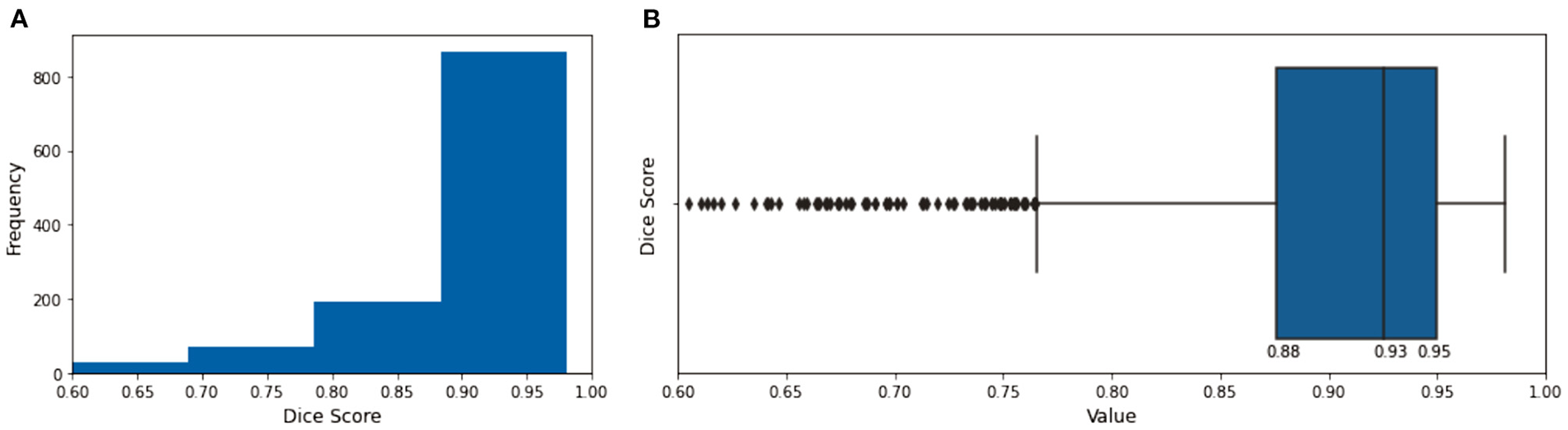 where |A| and |B| represent the cardinalities of set A and B (i.e., the number of elements in each set), respectively. The DSC, which has a range of [0,1], is a useful summary measure of spatial overlap that can be applied to quantify the accuracy in image segmentation tasks. Rather than using one test image to validate a segmentation model, it can be used as a statistical validation metric by computing the DSC of several images from a segmentation model and evaluating the mean DSC, allowing reproducibility and comparison of the model with other models. For the purpose of this study, we will consider the segmentation model's performance as good if the mean DSC is >0.8 on evaluation dataset.