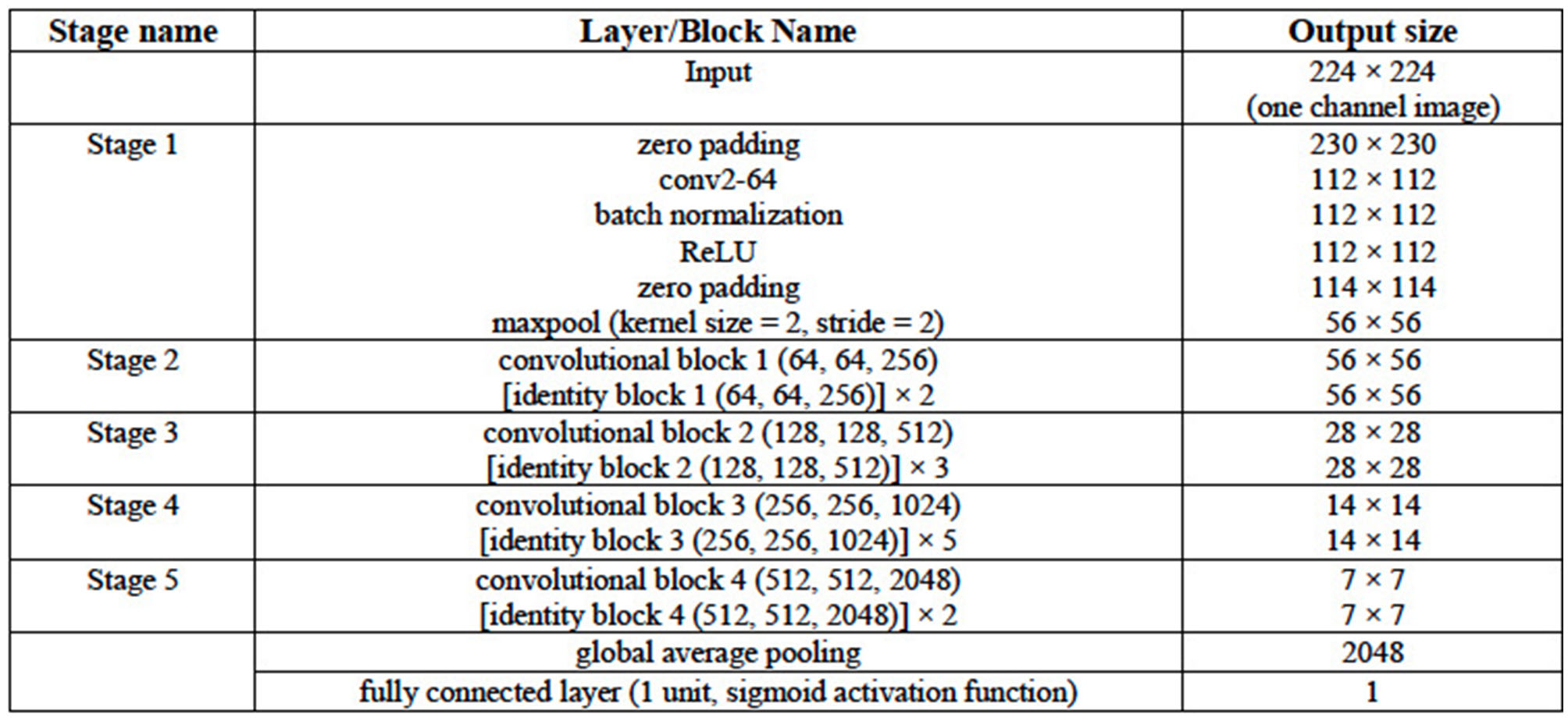 The convolutional layer parameters are denoted as “conv2-(number of filters),” where “conv2” denotes 2D convolution operation and the height and width of the 2D convolution window is 2 × 2. Each of the convolutional or identity blocks is followed by the number of filters ni of its three 2D convolutional operations as in “convolutional block x (n1, n2, and n3).” Two or more identity blocks stacked together are denoted as “[identity block x (n1, n2, and n3)] × k,” where k denotes the number of blocks stacked together.