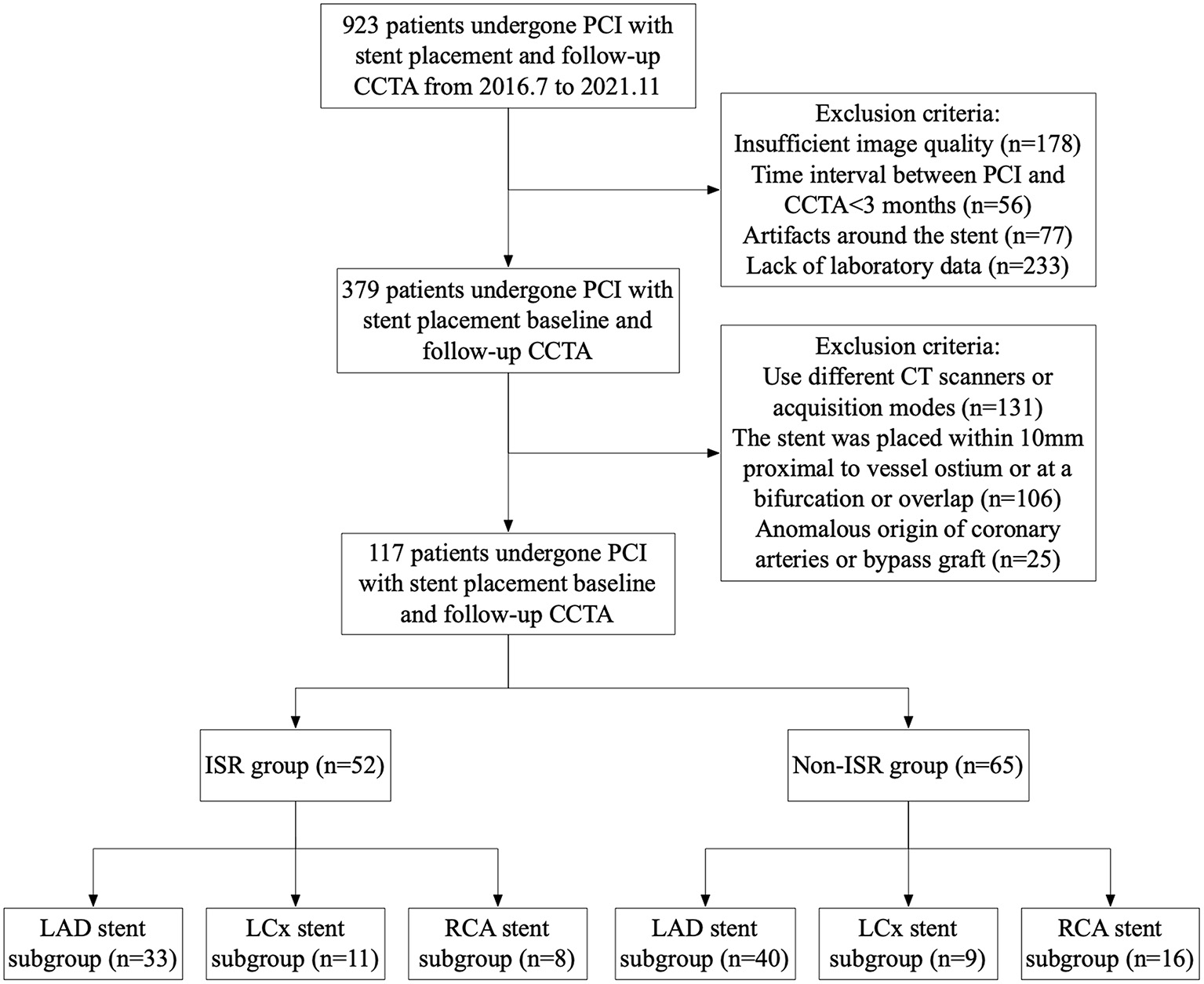 The local Medical Ethics Committee review board approved the study, and the requirement for written informed consent was waived for all patients due to the retrospective nature of the study. This study was conducted in line with the declaration of Helsinki. All patients who have undergone follow-up CCTA examination after a period of time of PCI with stenting placement in our hospital between July 2016 and November 2021 were enrolled in the study (Figure 1). The clinical exclusion criteria for the study were a time interval between the PCI and CCTA examination below 3 months; lack of laboratory data, patients with renal failure, a stent positioned within 10 mm proximal to the vessel or ostium, stents located at a bifurcation, overlapping stents, an anomalous coronary artery origin, and the presence of a coronary artery bypass graft. Patients whose CT images were acquired using CT scanners from different manufacturers and acquisition modes were excluded. Patients whose images could not be used to determine the presence of ISR formation within the stent lumen due to poor image quality or the presence of artifacts were not included in the study. Additionally, patients who had artifacts around the stent that affected the accuracy of the FAI measurement were also excluded. Only one stent per patient was included in the analysis. If a patient had multiple coronary stent stenosis, the most severe one was included in the ISR group. Conversely, if a patient had numerous stents without stenosis, the most visible one was included in the control group. Relevant demographics and medical history were obtained at baseline.