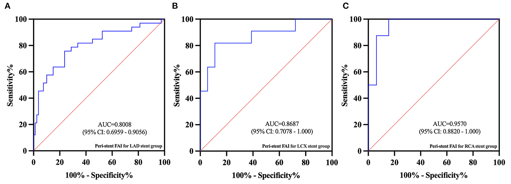 The peri-stent FAI values in the ISR group were significantly higher than those in the non-ISR group (−78.1 ± 6.2 HU vs. −87.2 ± 7.3 HU, p < 0.001). The predictive ISR features based on the LASSO analysis were peri-stent FAI, high-density lipoprotein cholesterol (HDL-C), apolipoprotein A1 (ApoA1), and high-sensitivity c-reactive protein (hs-CRP), with an AUC of 0.849, 0.632, 0.620, and 0.569, respectively. Binary logistic regression analysis determined that peri-stent FAI was uniquely and independently associated with ISR after adjusting for other risk factors (odds ratio [OR] 1.403; 95% CI: 1.211 to 1.625; p < 0.001). In the subgroup analysis, the AUCs of the left anterior descending coronary artery (LAD), left circumflex coronary artery (LCx), and right coronary artery (RCA) stents groups were 0.80, 0.87, and 0.96, respectively. The Pearson's correlation coefficient indicated a term moderately correlation between ISR severity and peri-stent FAI values (r = 0.579, P < 0.001).