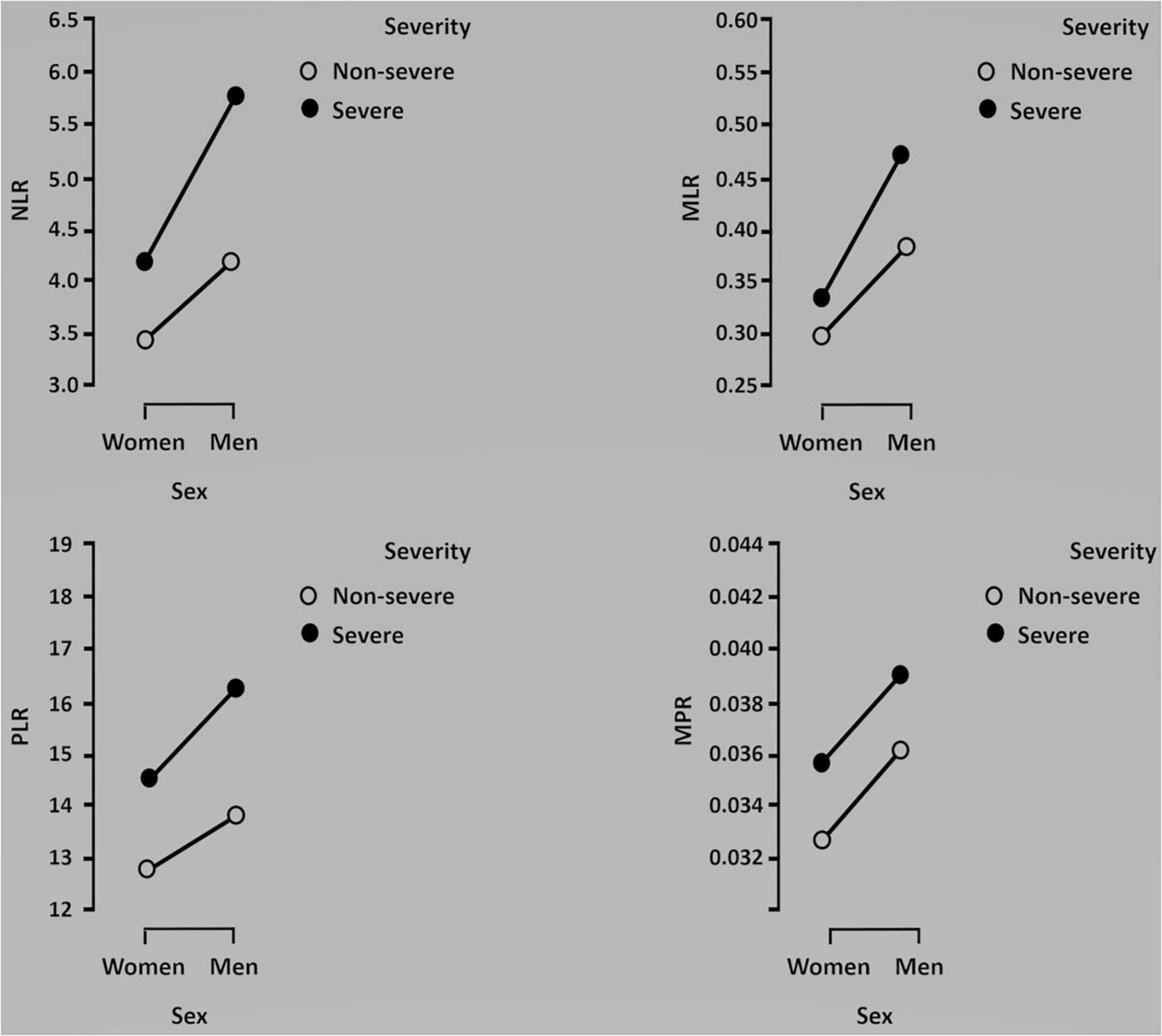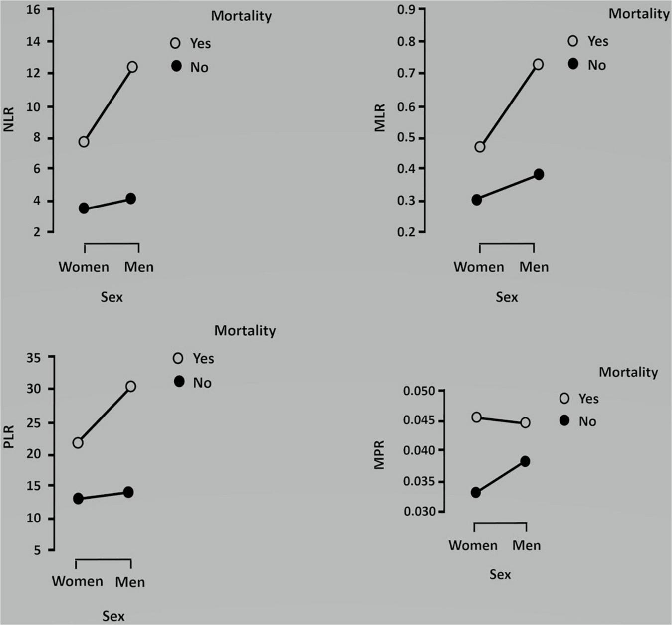 Combined hematology tests, such as the neutrophil-to-lymphocyte ratio (NLR), platelet-to-lymphocyte ratio (PLR), and monocyte-to-lymphocyte ratio (MLR), have become promising indicators of disease severity in patients with COVID-19 (1–7). In addition, the mean platelet volume (MPV), a hallmark of platelet activation and largely a high MPV/platelet count ratio (MPR), which predict long-term mortality in patients suffering from some cancers (8, 9), also constitute risk factors for severe pneumonia in patients suffering from COVID-19 (10). Their performance in predicting severity and mortality in patients with COVID-19 should then be secured in order to make medical care decisions (4). A limitation of these ratios is that they not only show ethnic differences (11, 12) but also they can be deeply influenced by sex (13), whose dependence has not yet been explored in COVID-19 disease.