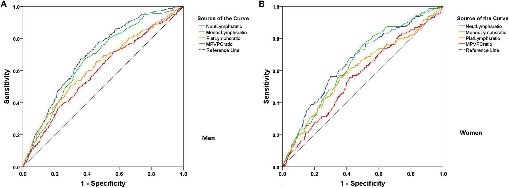 Receiver-operating characteristic (ROC) curves for the combined hematology tests evaluation of COVID-19 pneumonia severity segregated by sex. (A) Men and (B) Women.
