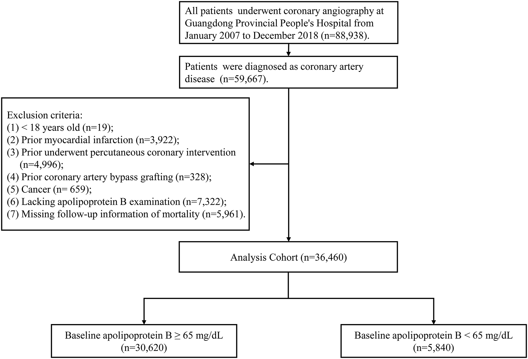 Our study cohort stemmed from a previous retrospective cohort of 88,938 patients with coronary angiography (CAG) and percutaneous coronary intervention (PCI) treatment at Guangdong Provincial People's Hospital from January 2007 to December 2018. (Clinicaltrials.gov NCT04407936). The diagnosis of CAD was the basic condition of the patients enrolled (N = 59,667) in the current study. Patients who met the following criteria were excluded:under 18 years of age (n = 19), previous myocardial infarction (n = 3922), pervious underwent percutaneous coronary intervention (n = 4,996), previous underwent coronary artery bypass grafting (n= 328), cancer (n = 659), missing the data of ApoB (n = 7,322), and lacking follow-up data about mortality (n = 5,961). Finally, 36,460 CAD patients without the conditions above were enrolled in the study (Figure 1). Guangdong Provincial People's Hospital approved the study proposal [No. GDREC2019555H(R1)]. The study was implemented following the Declaration of Helsinki.