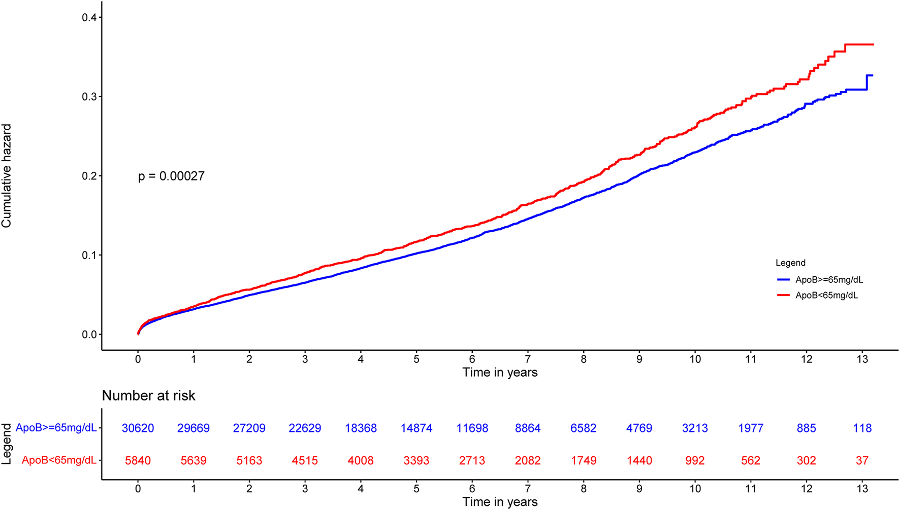 Cumulative incidence of all-cause death for ApoB <65 mg/dL group vs. ApoB ≥65 mg/dL group in CAD patients.