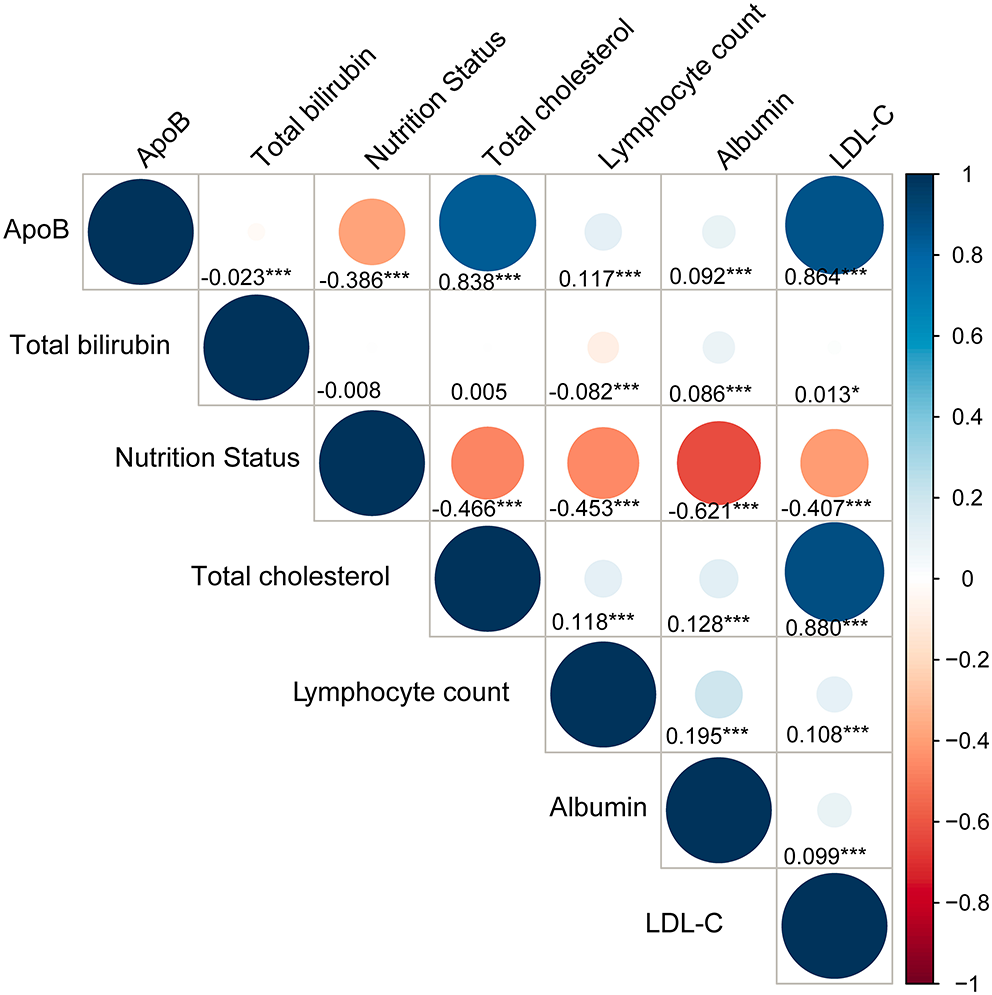 Correlations between ApoB, total bilirubin, nutritional status and its components. Nutritional status is assessed by Controlling Nutritional Status (CONUT) score. Total cholesterol, lymphocyte count and albumin are components of CONUT score. p < 0.05 *; p < 0.01**; p < 0.001***.