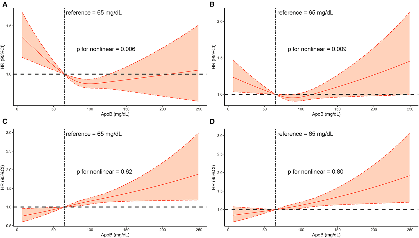 Restricted spline curve of the Baseline ApoB hazard ratio for mortality (long-term all-cause mortality) in CAD patients. (A): Model 1, Unadjusted model. (B): Model 2, Adjusted for age ≥75 years, sex, PCI and comorbidities including AMI, CHF, hypertension, diabetes mellitus, CKD, anemia, atrial fibrillation, COPD and stroke. (C): Model 3, Adjusted for malnutrition. (D): Model 4, Adjusted for all covariates: age ≥75 years, sex, PCI and comorbidities including AMI, CHF, hypertension, diabetes mellitus, CKD, anemia, atrial fibrillation, COPD, stroke and malnutrition.