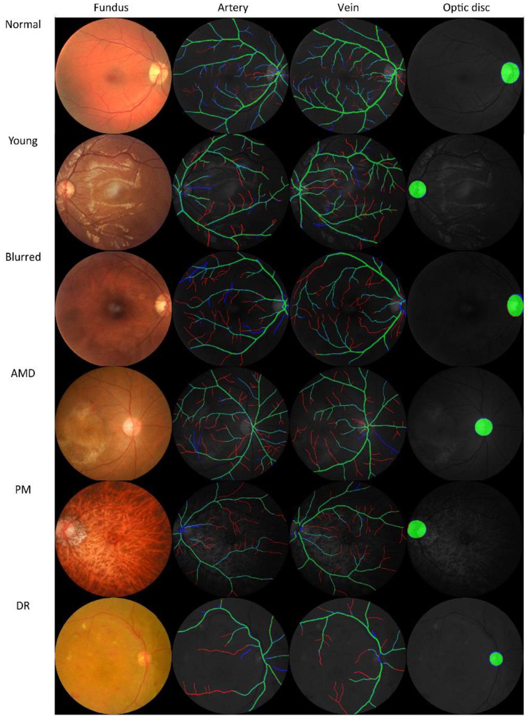 | Ours | artery/vein, optic disc | 2021 | 420 | macula-disc | various | various | DR, glaucoma, AMD, PM | Various |