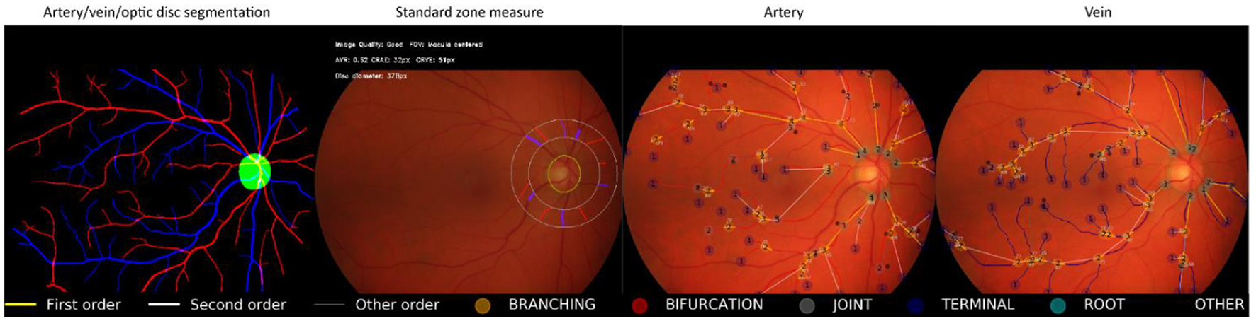 Computer-assisted technology has enabled the quantification of retinal morphology. A series of machine learning methods and software tools have been developed for the quantified assessment of the retinal vasculature. Widespread use of these tools however has been limited due to their need for manual input [IVAN (6), SIVA (7), VAMPIRE (8)], time-consuming nature [IVAN (6), SIVA (7)], applicability to only specific retinal regions [IVAN (6), SIVA (7)], or a limited number of measurement parameters [IVAN (6), VAMPIRE (8), QUARTZ (9, 10)].