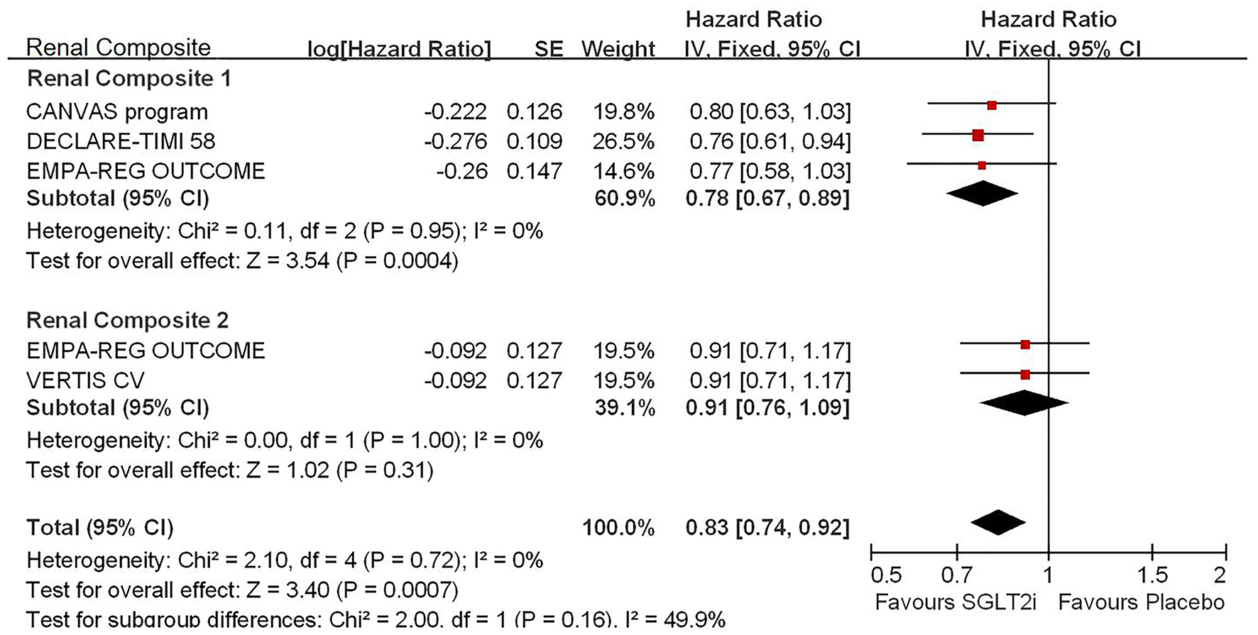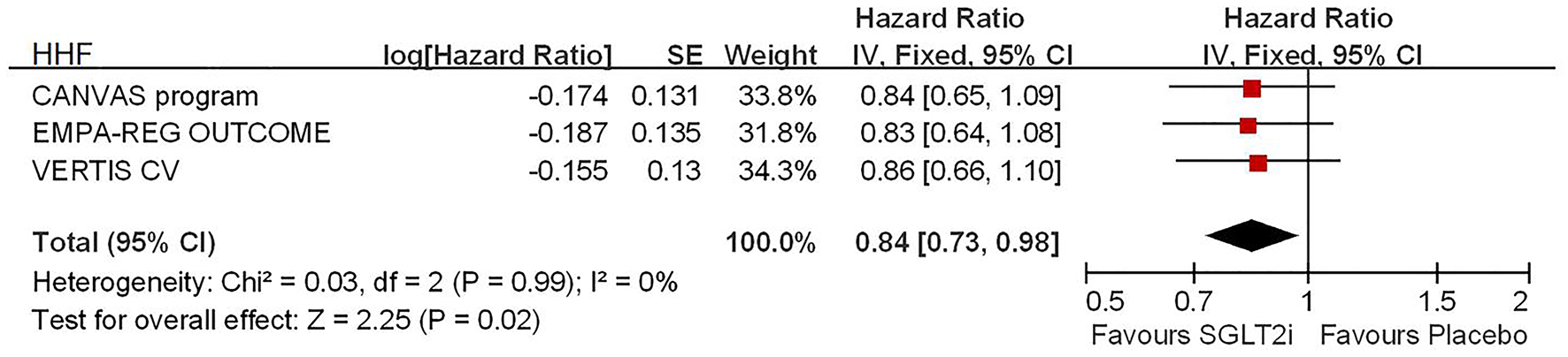 Among 42,568 patients in the four trails, the use of SGLT2i was associated with significantly reduced CV death/HHF (HR, 0.84; 95% CI, 0.73 to 0.98; p = 0.02; Figure 1), HHF (HR, 0.84; 95% CI, 0.73 to 0.98; p = 0.02; Figure 2), and renal composite outcomes (HR, 0.83; 95% CI, 0.74 to 0.92; p = 0.0007; Figure 3; renal Composite 1 concluded 40% decrease in eGFR, end-stage kidney disease, or renal death; renal Composite 2 included renal death, renal dialysis/transplant, or doubling of serum creatinine from the baseline) in diabetic patients with CVD or at high CV risk.