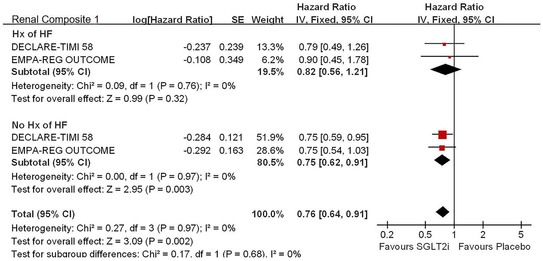 For the history with or without HF, SGLT2i significantly reduced the risk of renal composite outcomes in patients without history of HF (HR, 0.75; 95% CI, 0.62 to 0.91; p = 0.003 < 0.025; seeFigure 4).