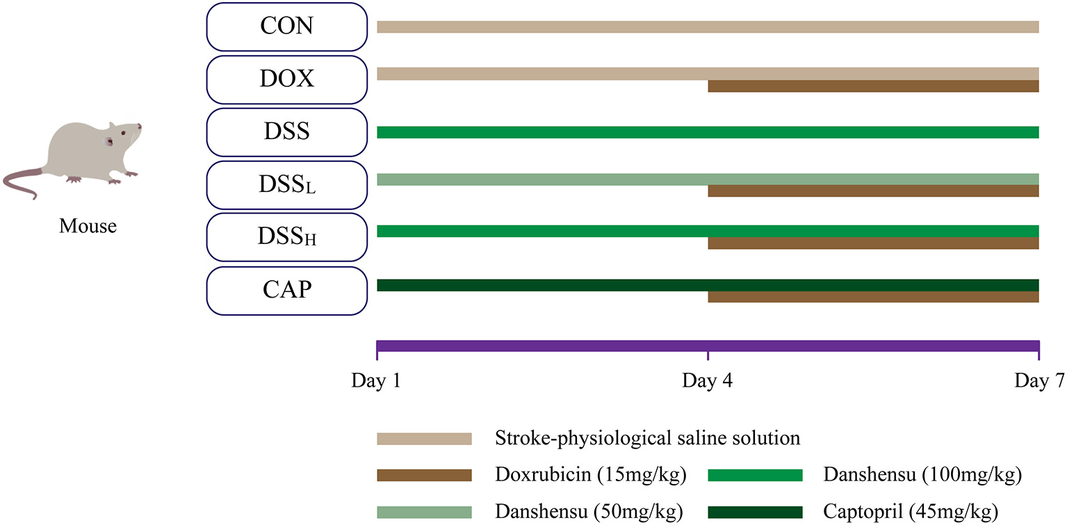 After adaptive feeding for a week, and then 60 male adult KM mice were randomly divided into six groups (10 mice in each group): CON group, DOX group, DSS group, low-dose DSS + DOX group (DSSL), high-dose DSS+DOX group (DSSH), CAP+DOX group (CAP). The DOX (15 mg/kg) dose was established based on previous studies (33). The DSSL and DSSH groups were administrated with DSS (50, 100 mg/kg/day, i.p.), and the CAP group was administrated with CAP (45 mg/kg/day, i.p.) separately. Normal saline was given to the CON group and DOX group and corresponding doses of drugs were given to the DSS pretreatment group and CAP group for 3 consecutive days. After 4 days of pretreatment, DOX was administered 6 h after protective drug injection in days 4–7 (Figure 2) (24).